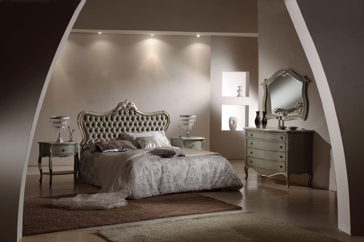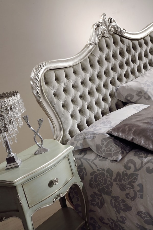 Letto matrimoniale con testata intagliata e imbottita capitonè.