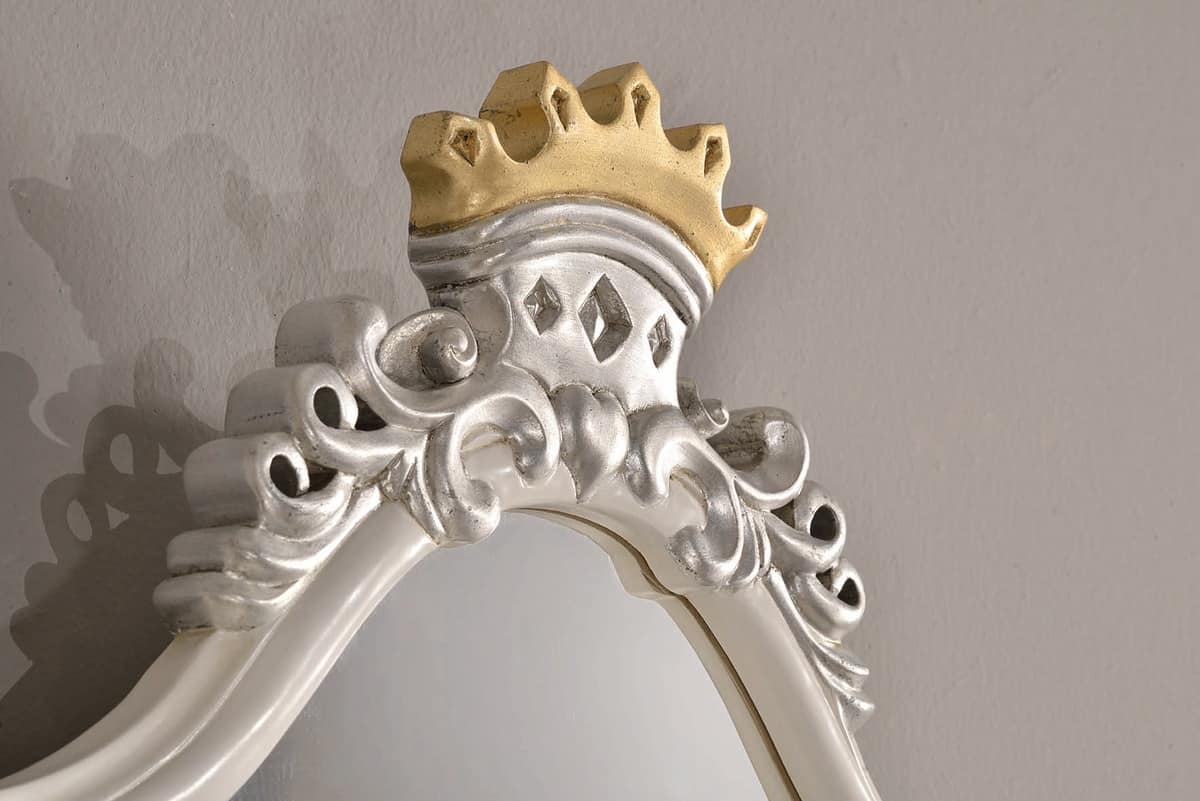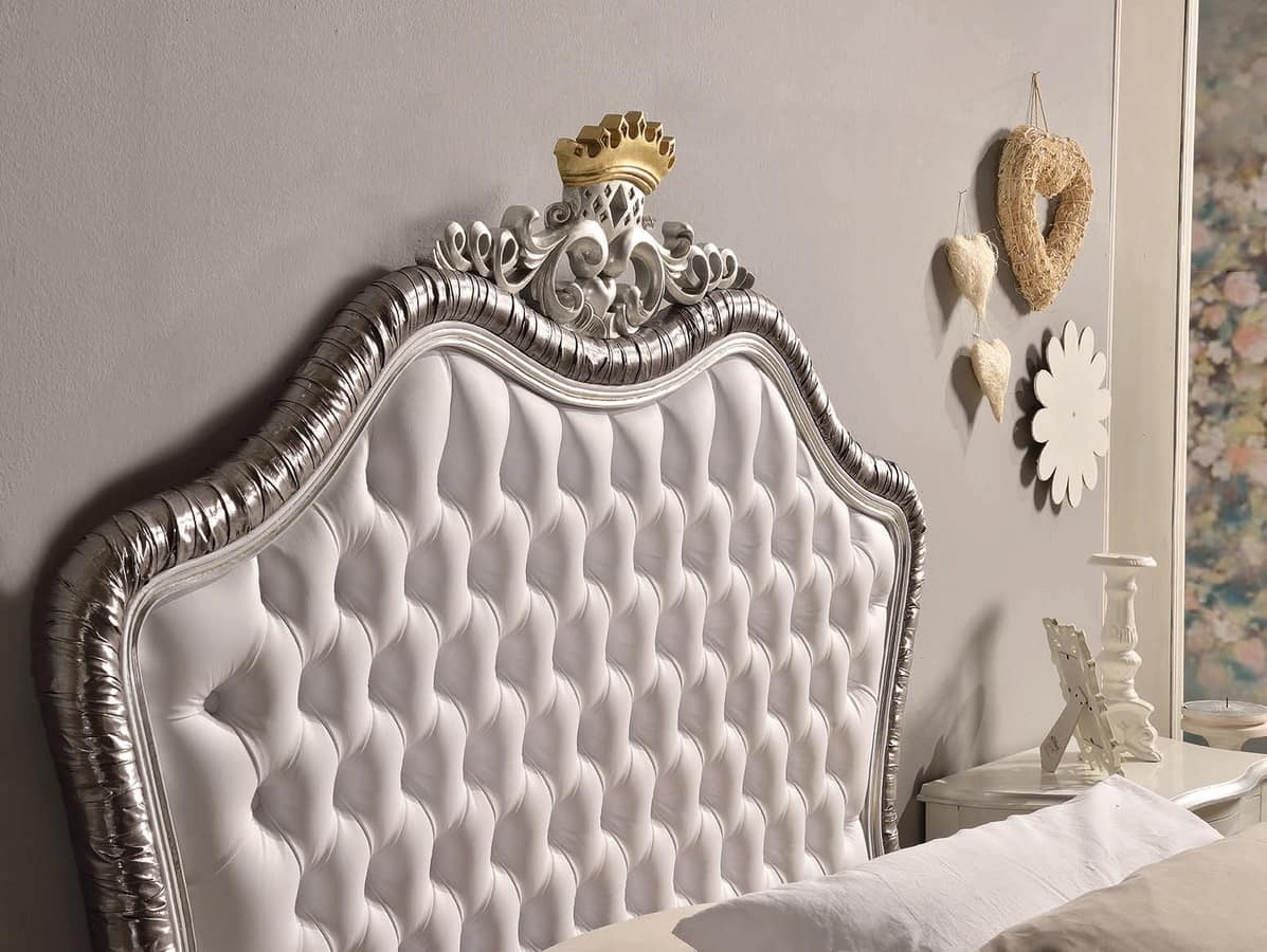 Letto singolo con giroletto, laccato bianco, con particolari in foglia argento.