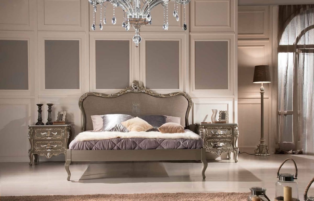 Letto matrimoniale con giroletto con testata intagliata a mano.