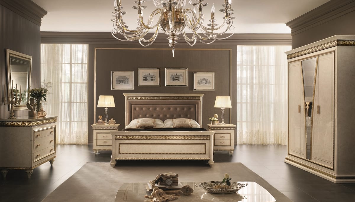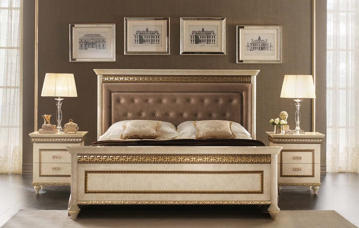 Letto in stile neoclassico, con testiera imbottita