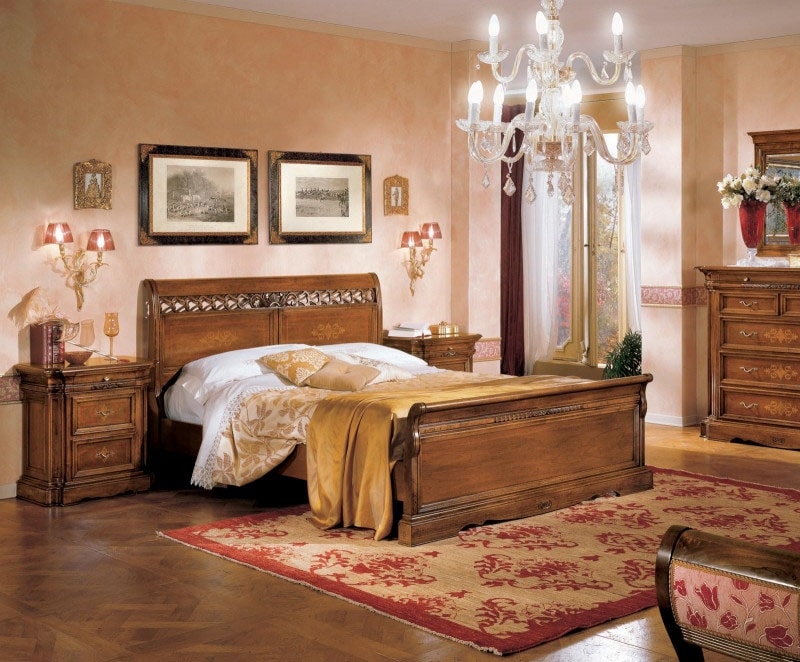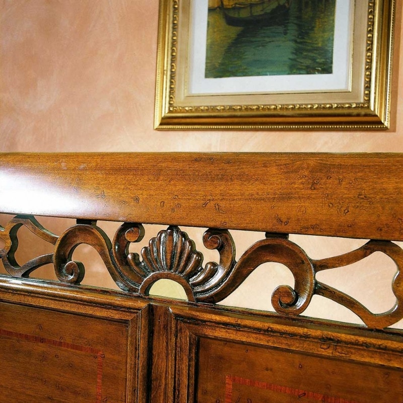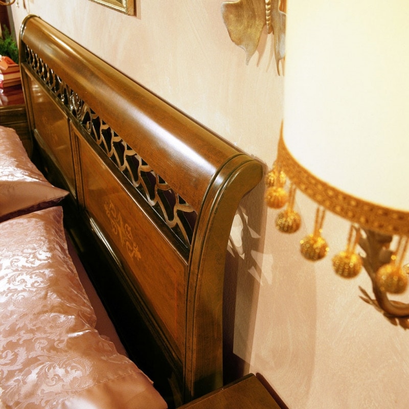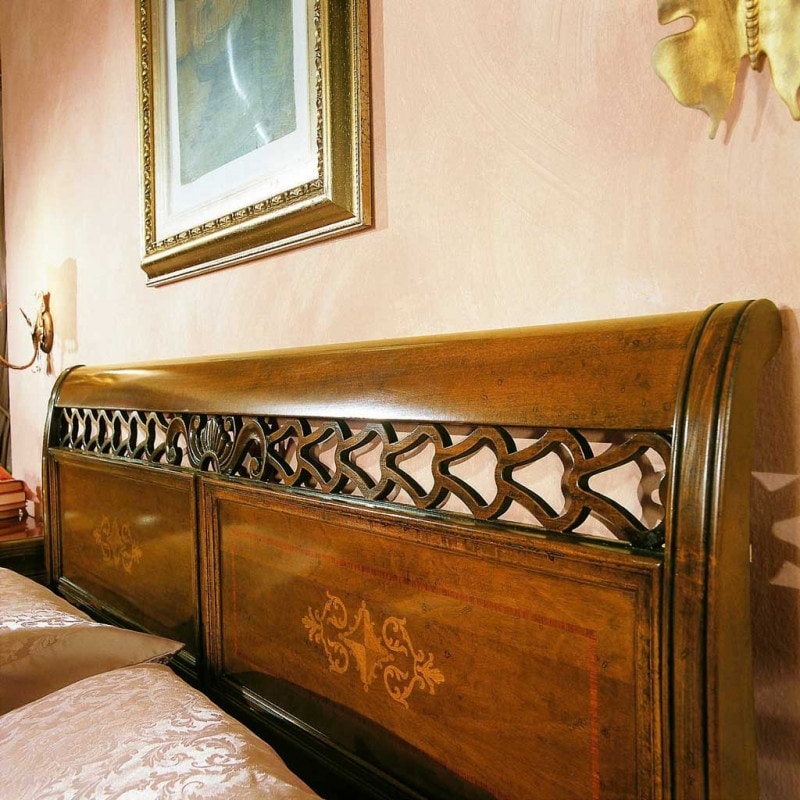 Richiedi prezzi Prodotti similiLetto matrimoniale con testata e pediera sagomate. La testata è arricchita da una cartella traforata ed intagliata e un pannello diviso in due parti con gli intarsi esclusivi di questa collezione. Sulla pediera sono presenti due intagli, uno nella parte bassa e uno nella parte alta, sotto il profilo sagomato che conclude la pediera verso l’alto.