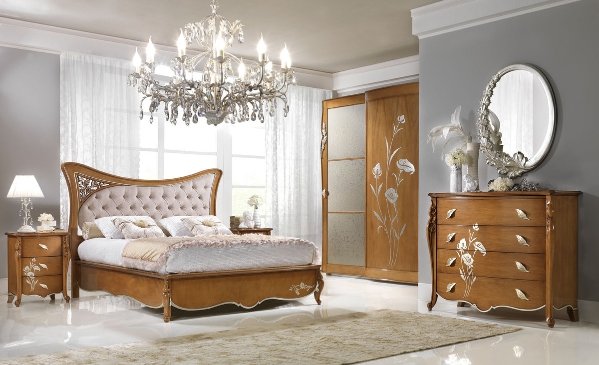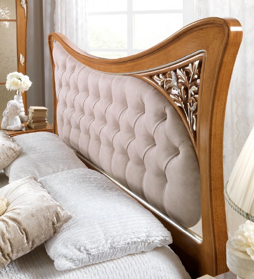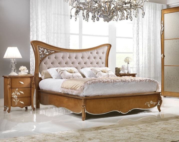 Letto in legno con testiera capitonné imbottita, con decoro traforato. Giroletto in legno, stile classico.