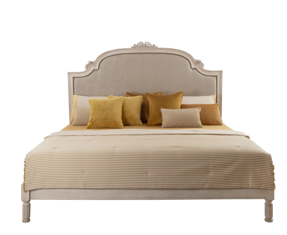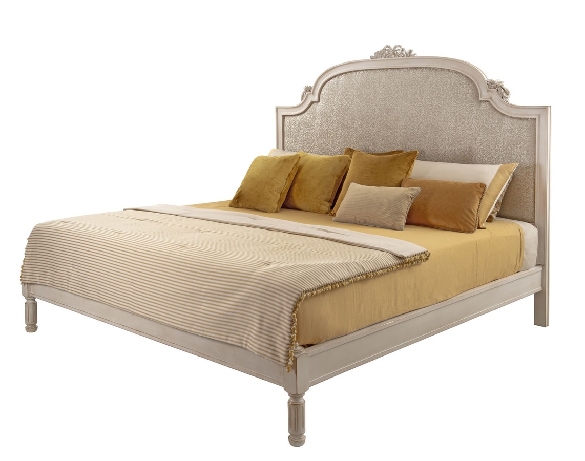 Letto stile classico, in legno intagliato, testiera imbottita