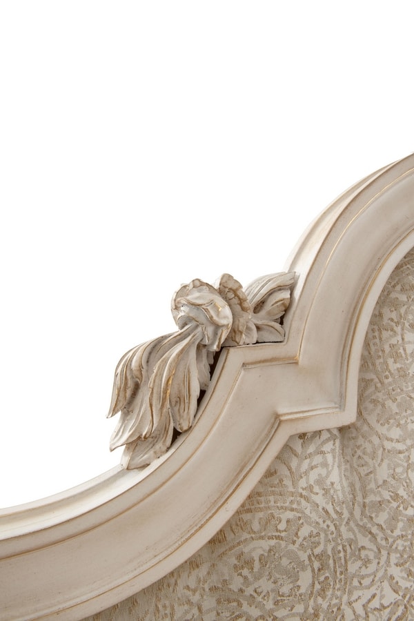 Letto con testata intagliata in legno, pannello imbottito in tessuto con giroletto in legno, finitura LAFM laccato spelato tempera francese colore bianco meringa fondo oro foglia.