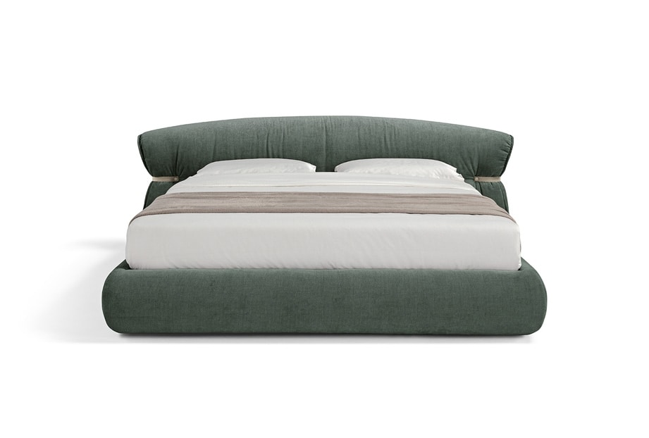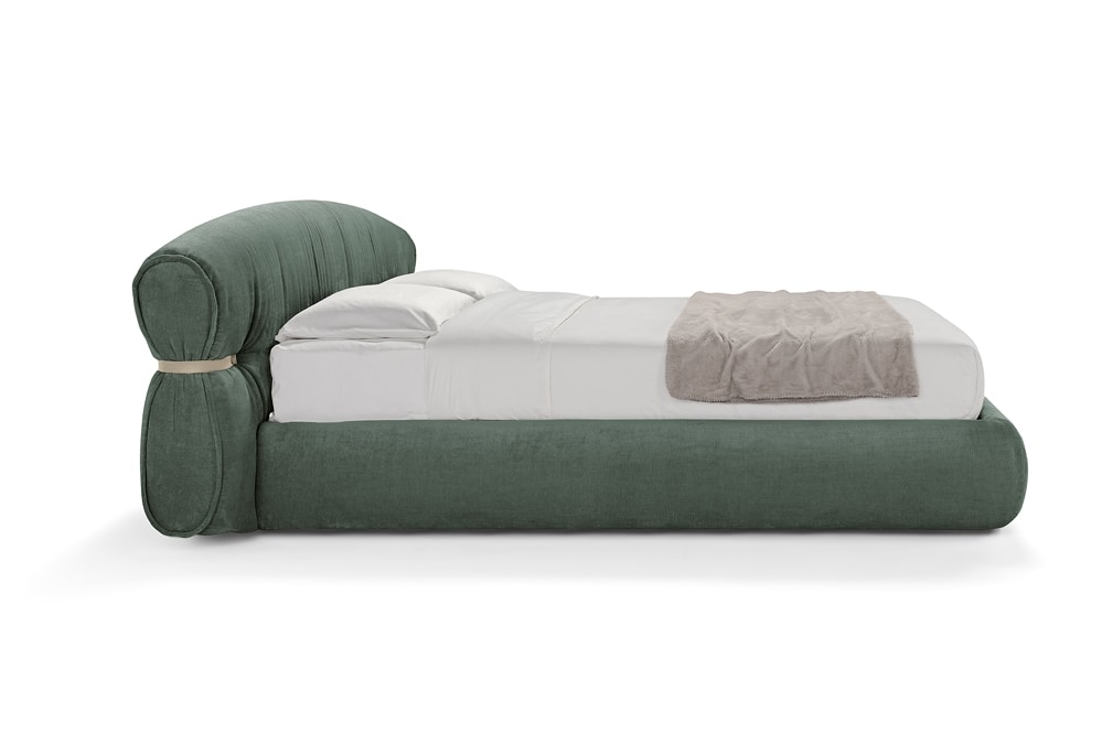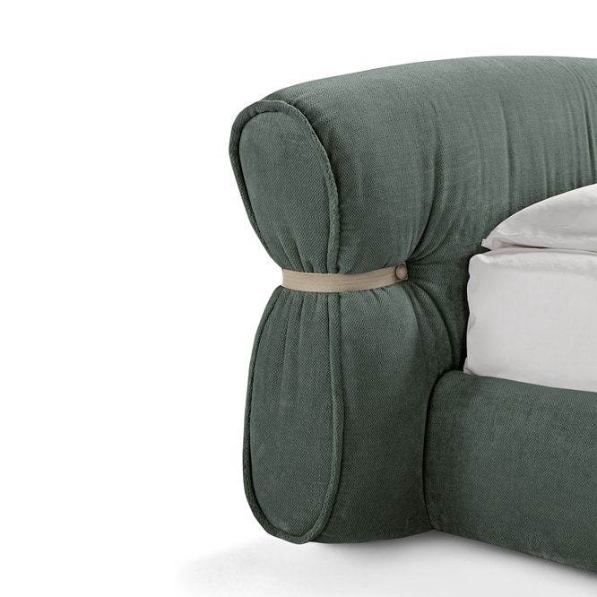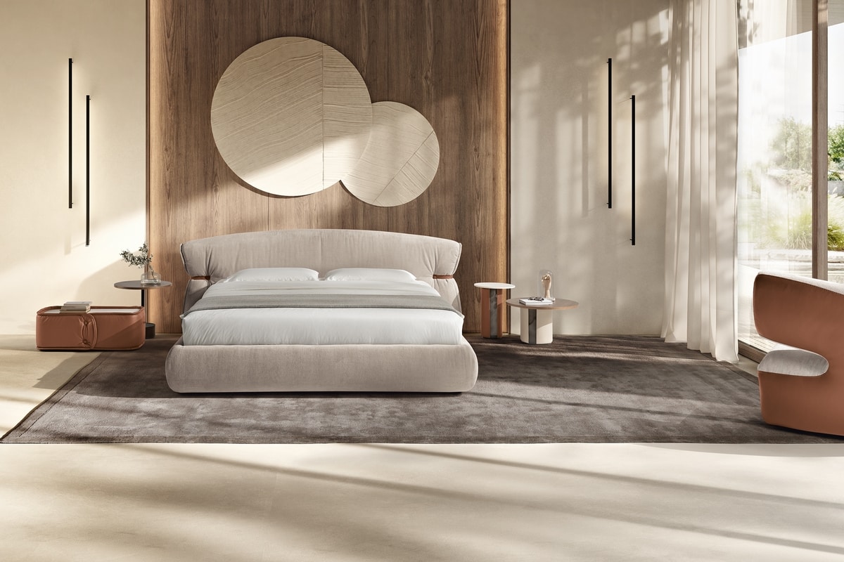 Soffice, confortevole e che invita al riposo: il letto Bon Bon si caratterizza per un design dal quale sono banditi gli angoli a favore di linee morbide e accoglienti. Contraddistinto dal dettaglio sartoriale di una fascia in pelle a contrasto che segna lateralmente la testiera conferendole dinamismo, è interamente rivestito in tessuto ecologico, soffice e dalla texture vellutata.