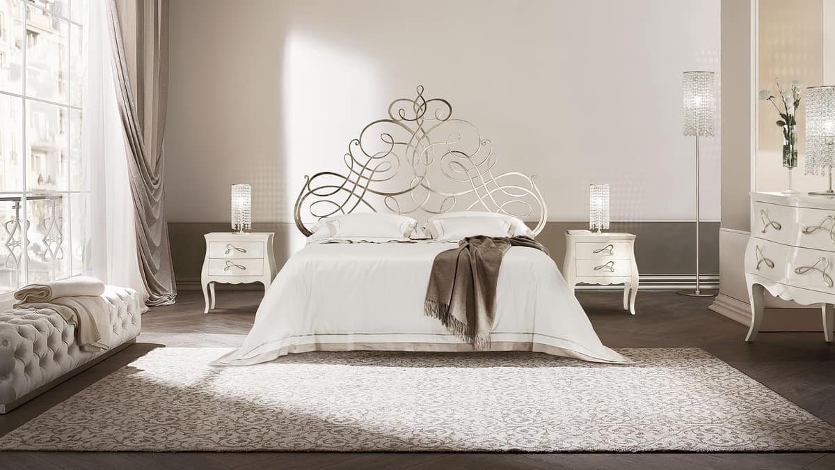 Letto in ferro piatto trafilato, decoro tagliato a laser e battuto a caldo, superfici e saldature a filo interamente levigate manualmente. Particolari rastremati e forgiati. Otto passaggi di finitura realizzati a mano, dalla base interna alla protezione con fissativo trasparente.