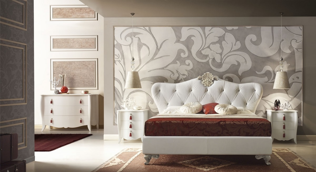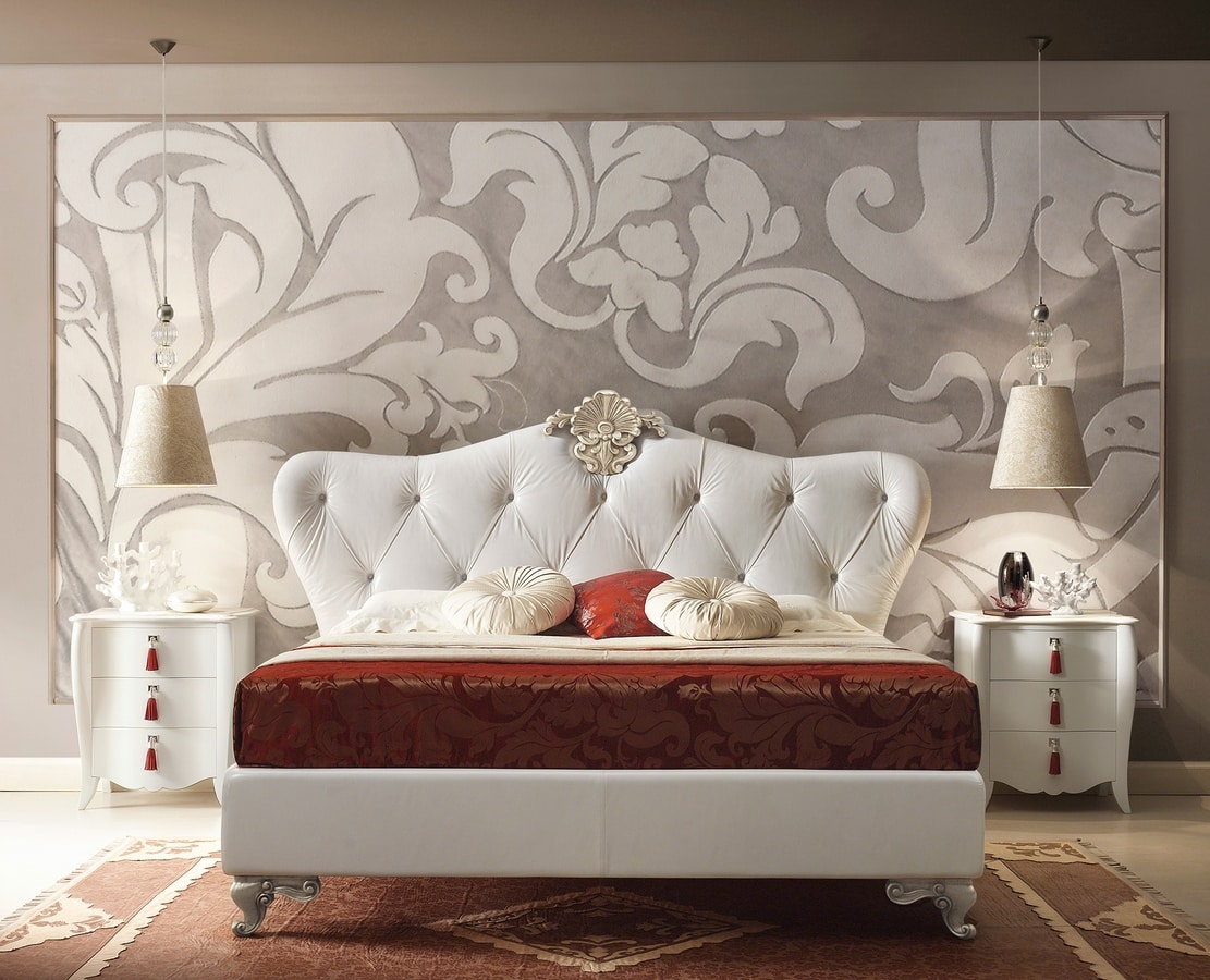 Letto matrimoniale in legno massiccio, intagli foglia argento, rivestimento in pelle bianca, testiera capitonné.