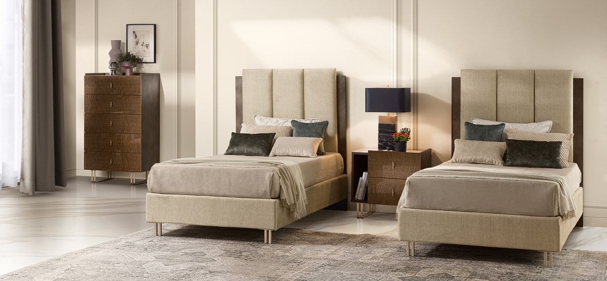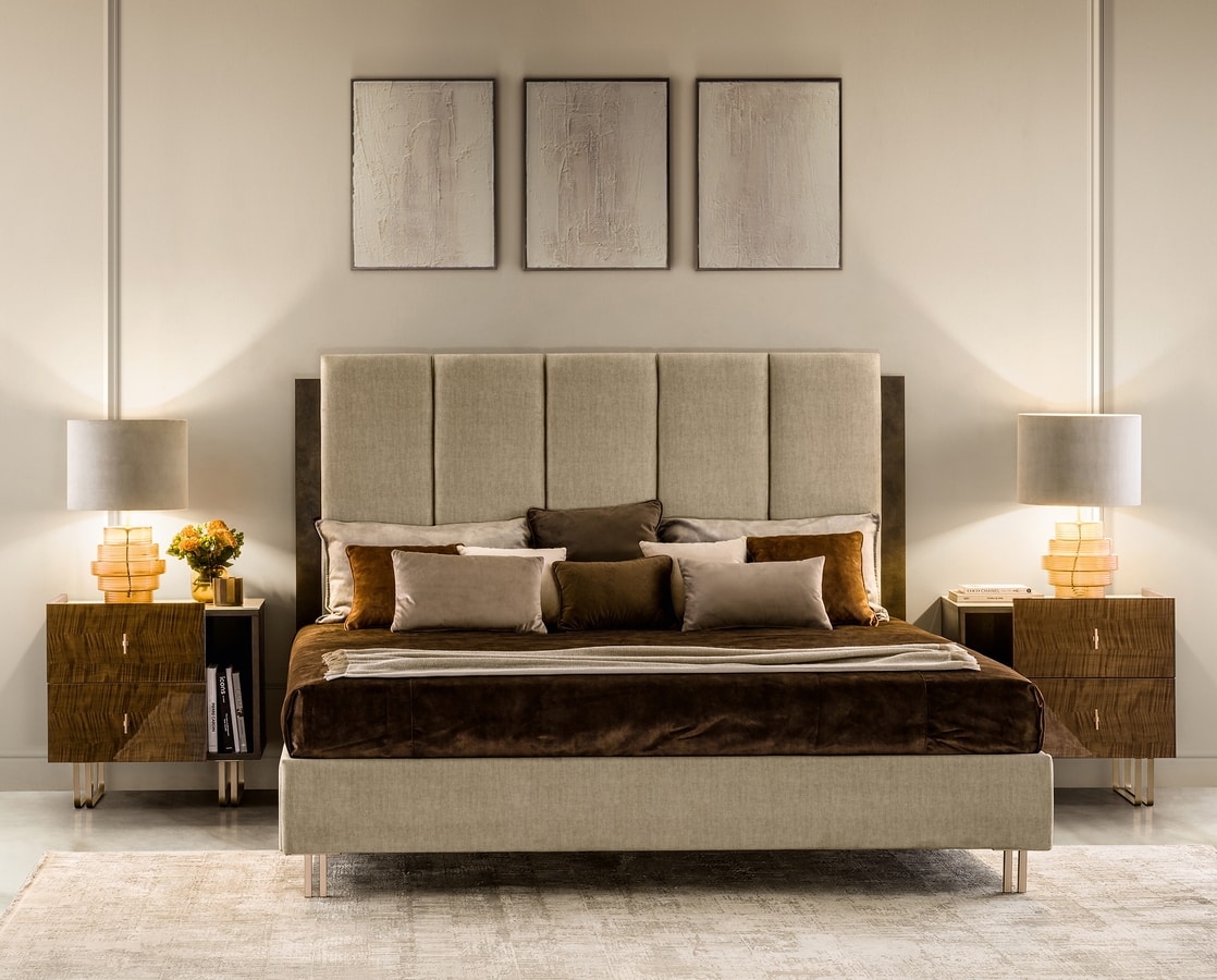 Richiedi prezzi Prodotti similiDue le varianti del letto, una con fascione e pediera in finitura bronzo opaca e una versione interamente imbottita.