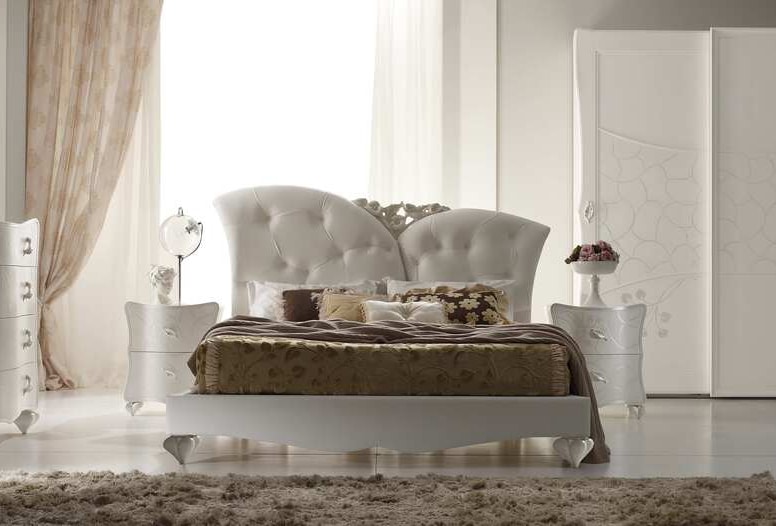 Letto con testiera imbottita in ecopelle, arricchina con prezioso intaglio. Struttura in legno laccato bianco.
