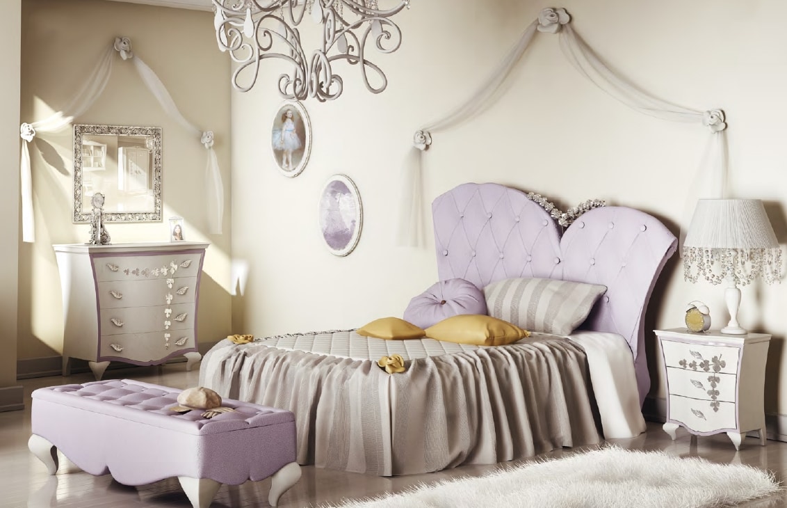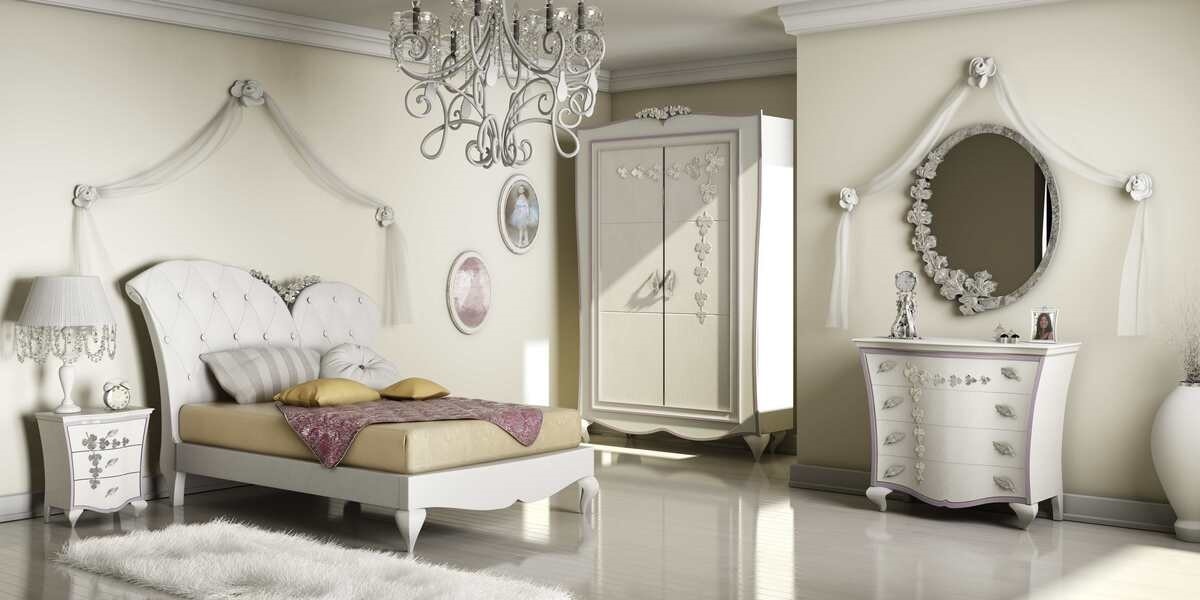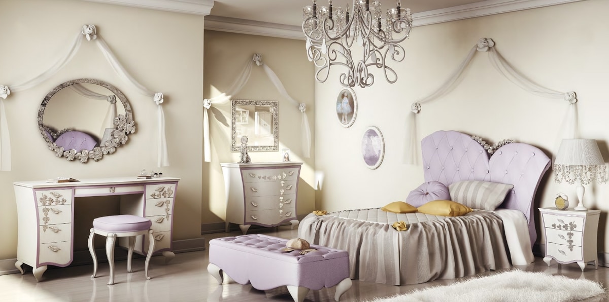Letto con rivestimento in ecopelle, arricchita da un intaglio floreale finitura argento. Piedi in legno laccato bianco.