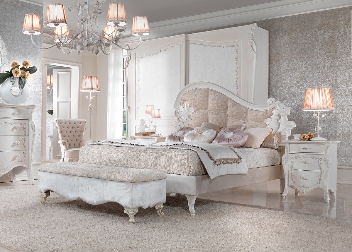 Letto in stile classico, con testiera e struttura imbottiti. Testiera e piedini in legno laccato con intagli.