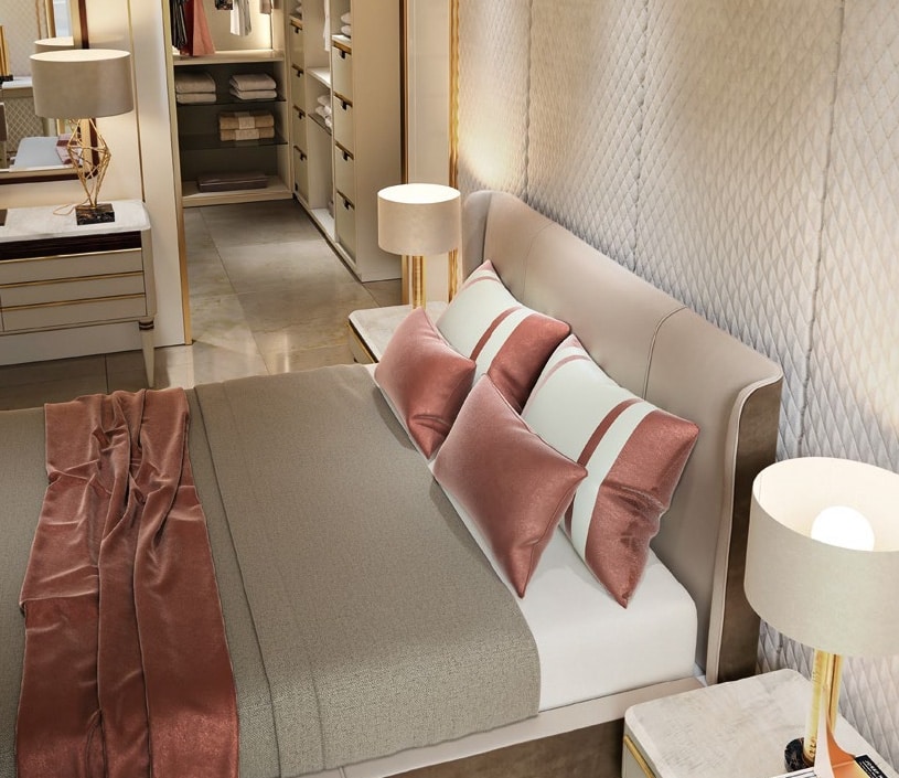 L’unione dei toni chiari di tutti gli elementi d’arredo con gli inserti e i profili dorati, conferisce alla notte della collezione Roma un’immagine sofisticata e singolare, vagamente imperiale. L'intimità si sposa con la finezza, senza rinunciare ad una aristocratica funzionalità.