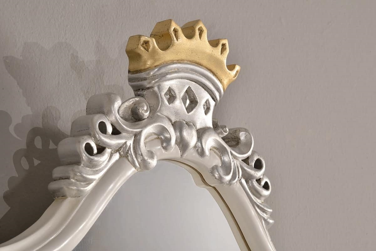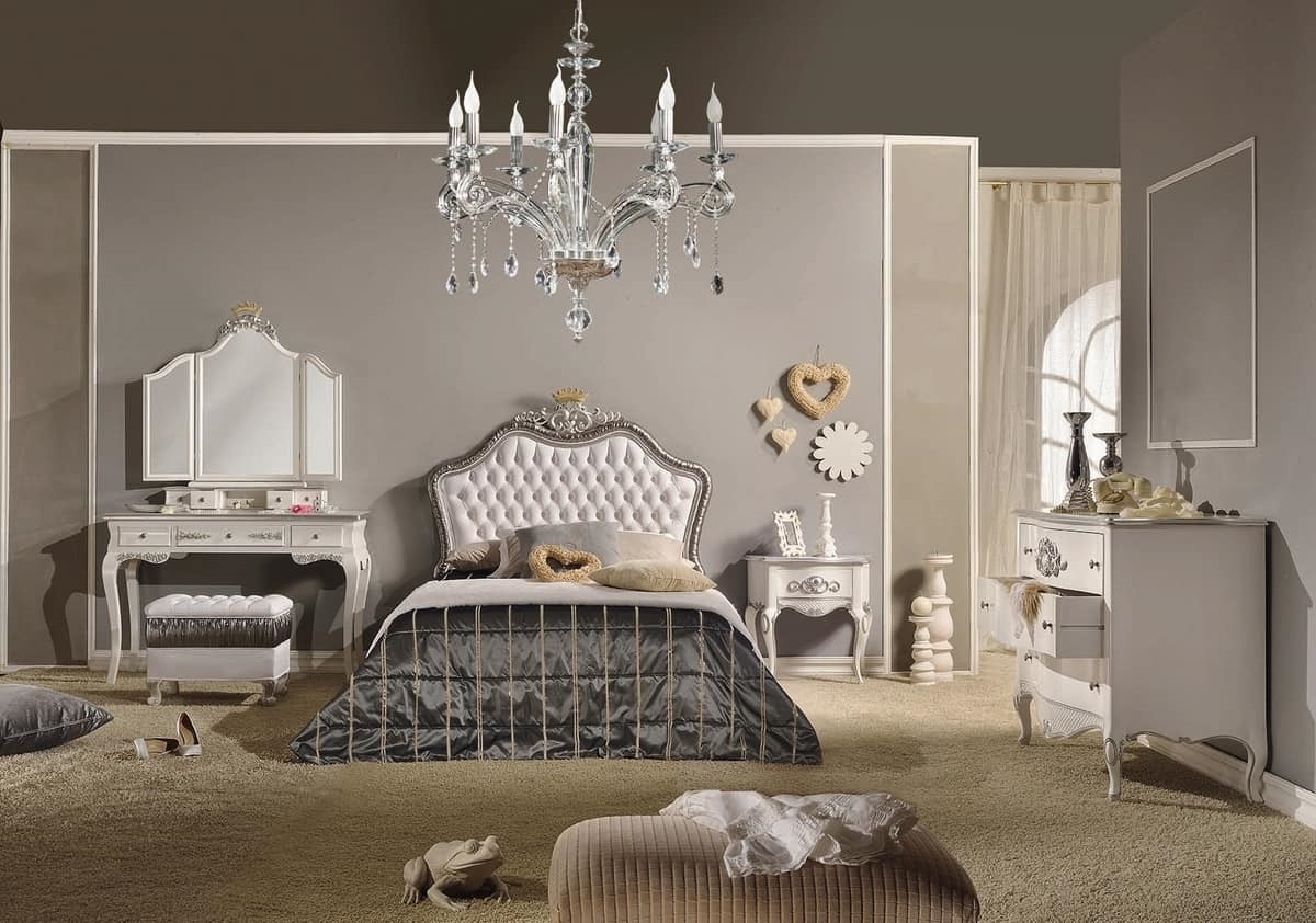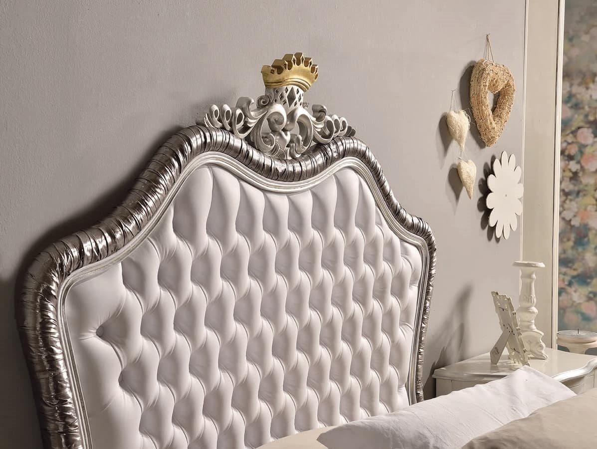 Letto singolo con giroletto, specchiera con alette, toilette, pouff, comò e comodino laccato bianco e particolari in foglia argento.