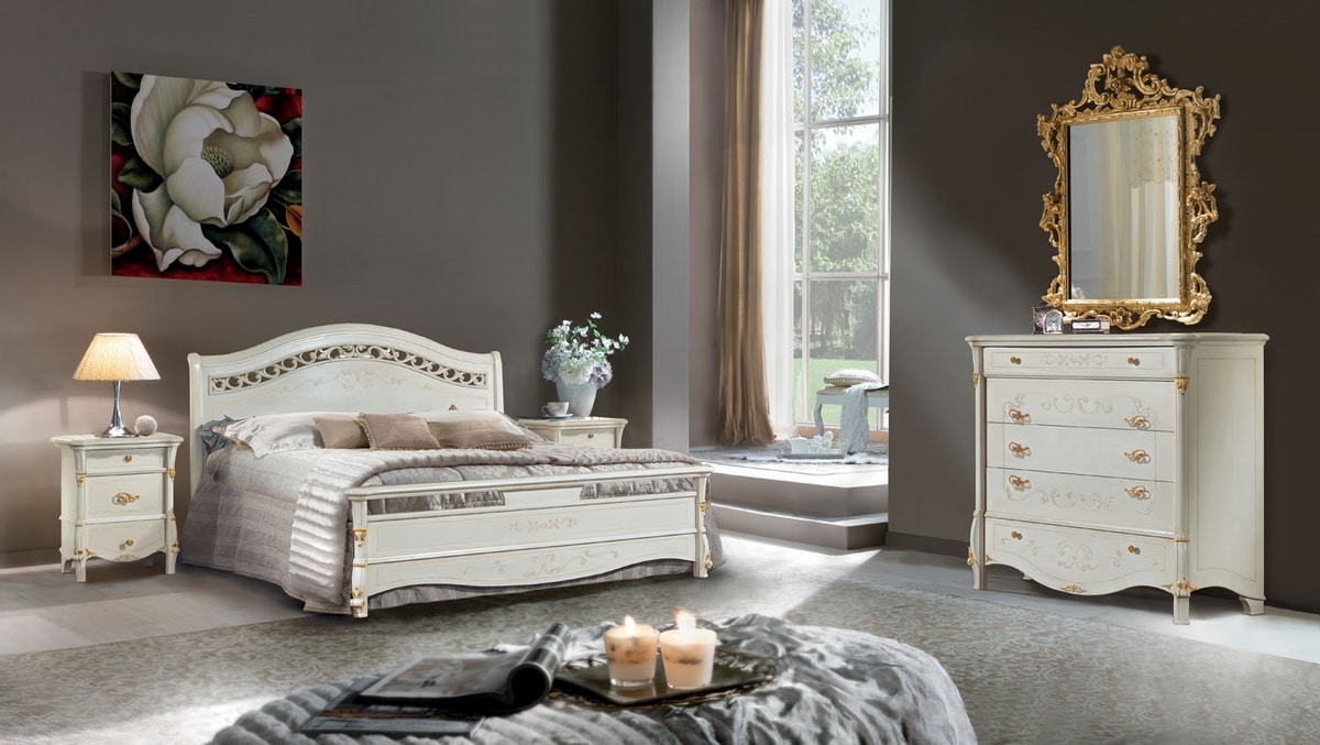 Letto in legno, con testata intagliata e decorazioni artigianali.