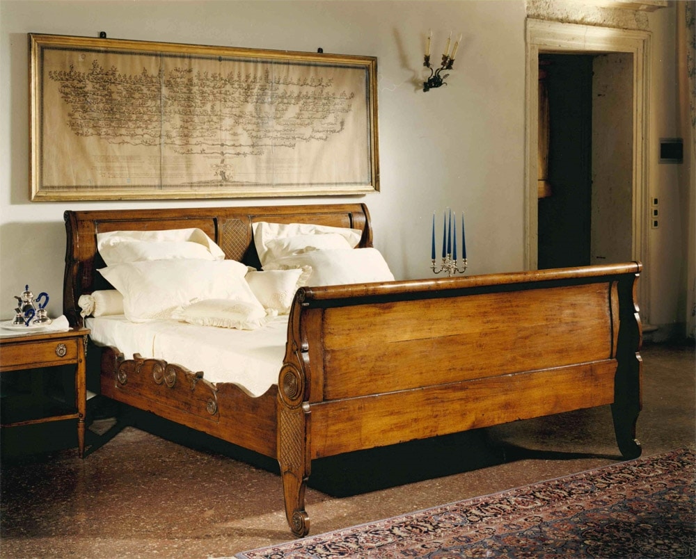 Grande letto a barchetta in noce, ispirato allo stile Luigi Filippo. Testiera e fianchi intagliati con delicate volute floreali e trame geometriche.