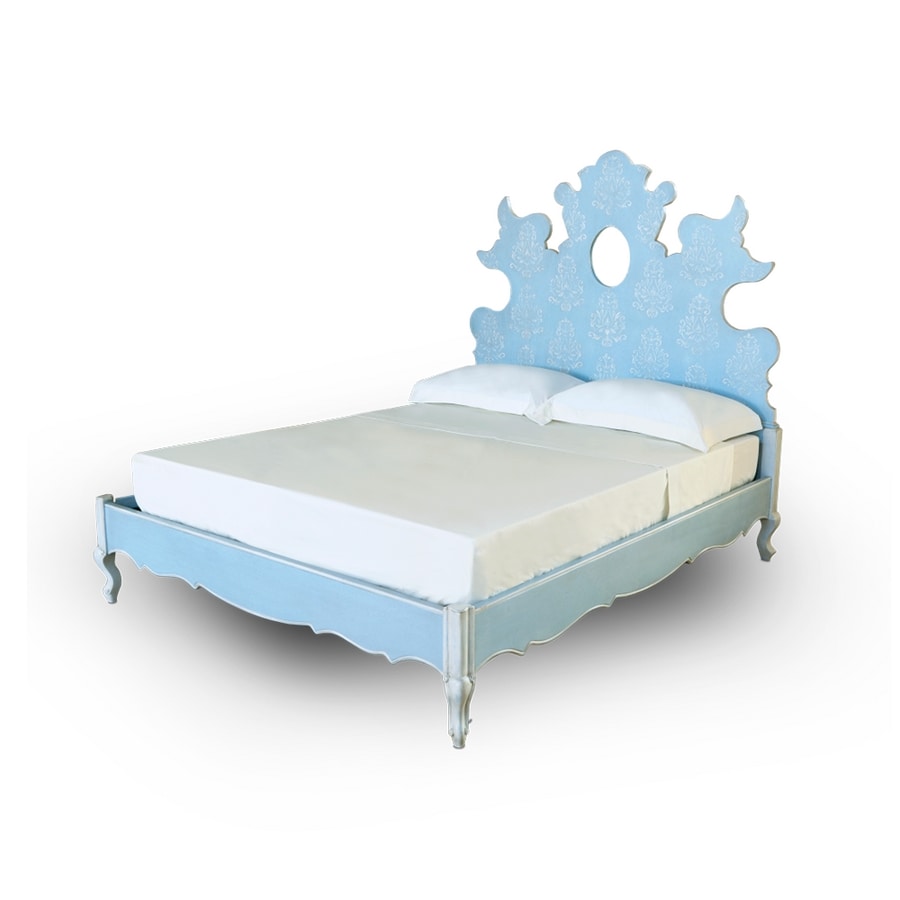 Letto a prezzo outlet, laccato anticato azzurro e bianco, testata decorata.