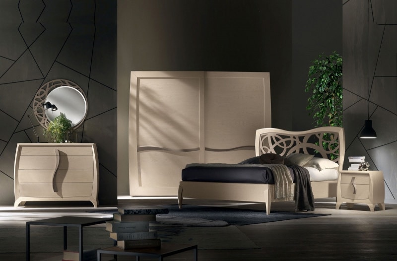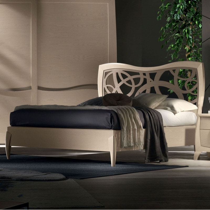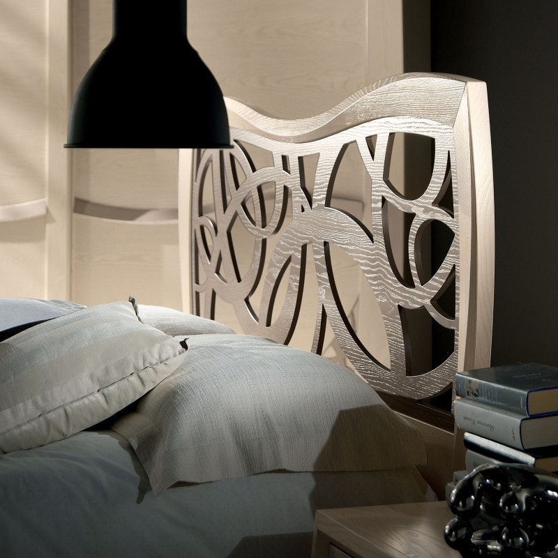 Letto con testata sagomata e inserto traforato.