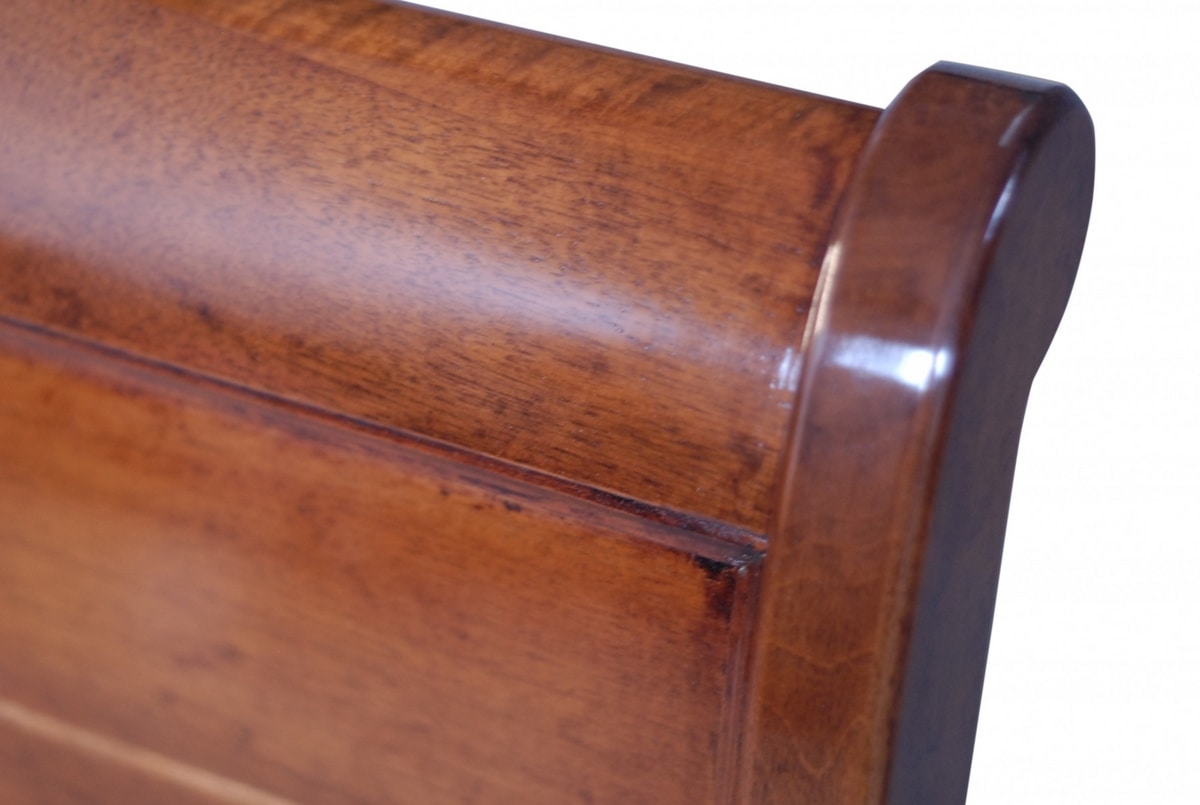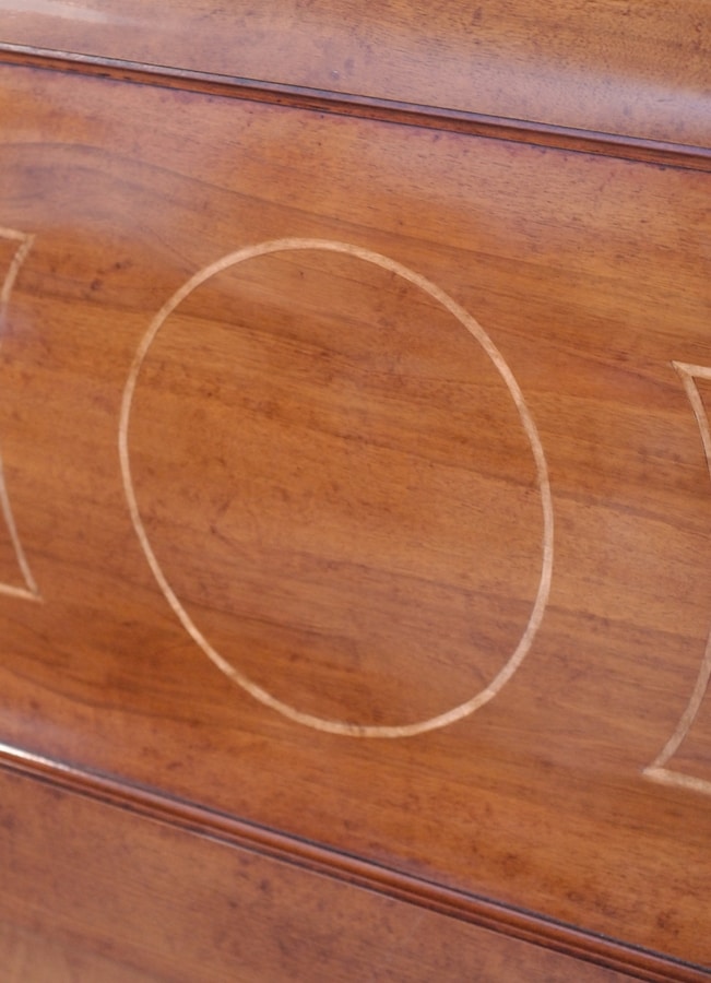 Letto a barchetta in noce, ispirato allo stile del 1700 italiano. Testiera e pediera sporgenti con profilo geometrico intarsiato in acero e piedini sagomati. Misure per rete: 170x200.