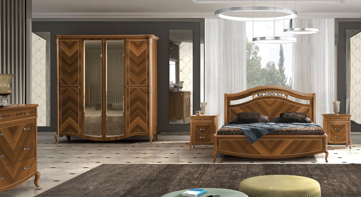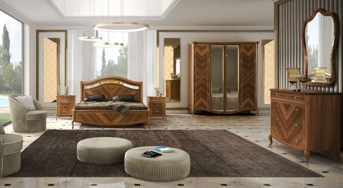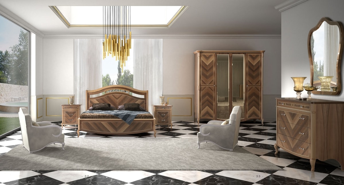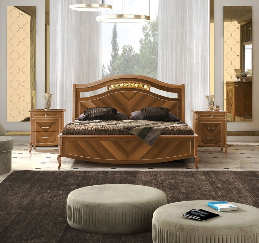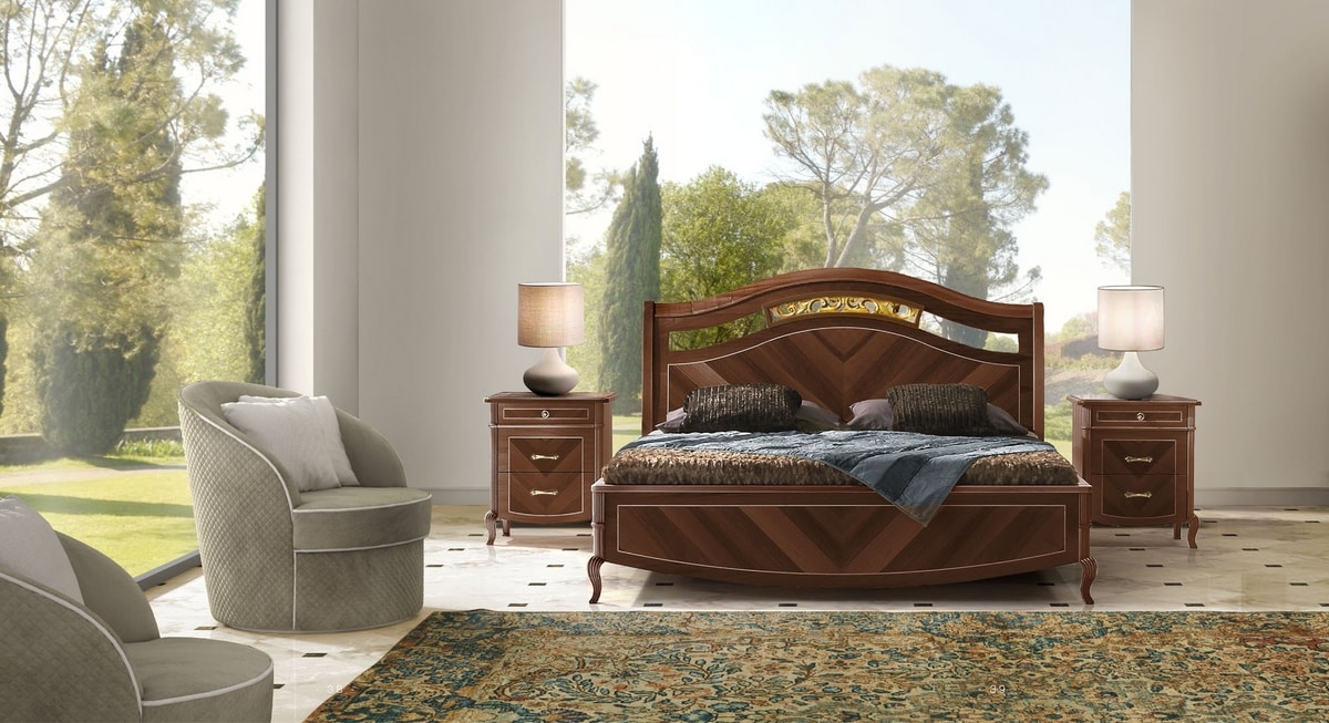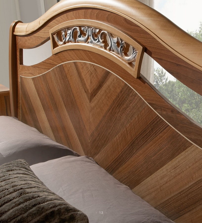Letto con testiera e struttura in legno. Impiallacciata in vero legno di noce con lavorazioni artigianli ed intarsi che la rendono preziosa e unica. Disponibile in 3 tonalità di noce, arrichita di dettagli i foglia Oro o Argento.
