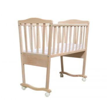 Culla interamente in legno, dotata di ruote, realizzata in stile essenziale, ideale per uso domestico e asili nido.