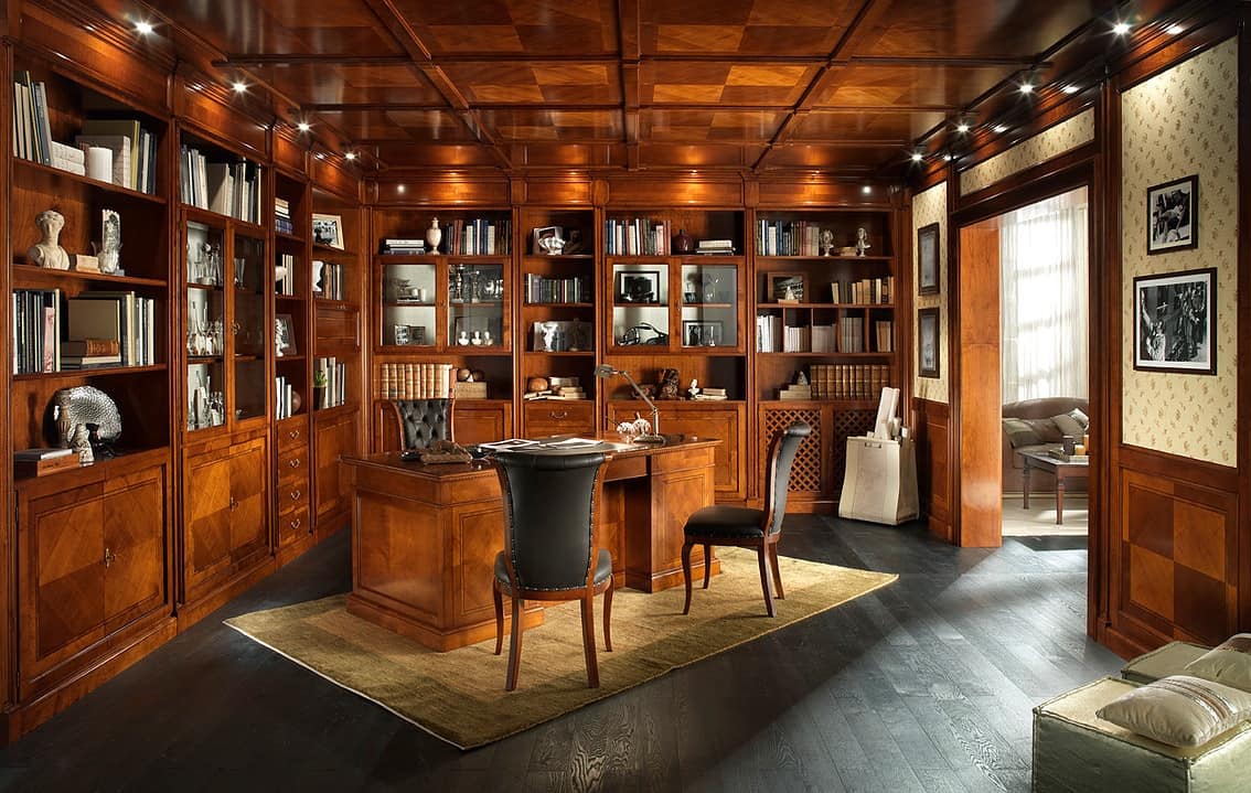 Richiedi prezzi Prodotti similiStudio su misura, in ciliegio intarsiato, con boiserie e controssoffitto.