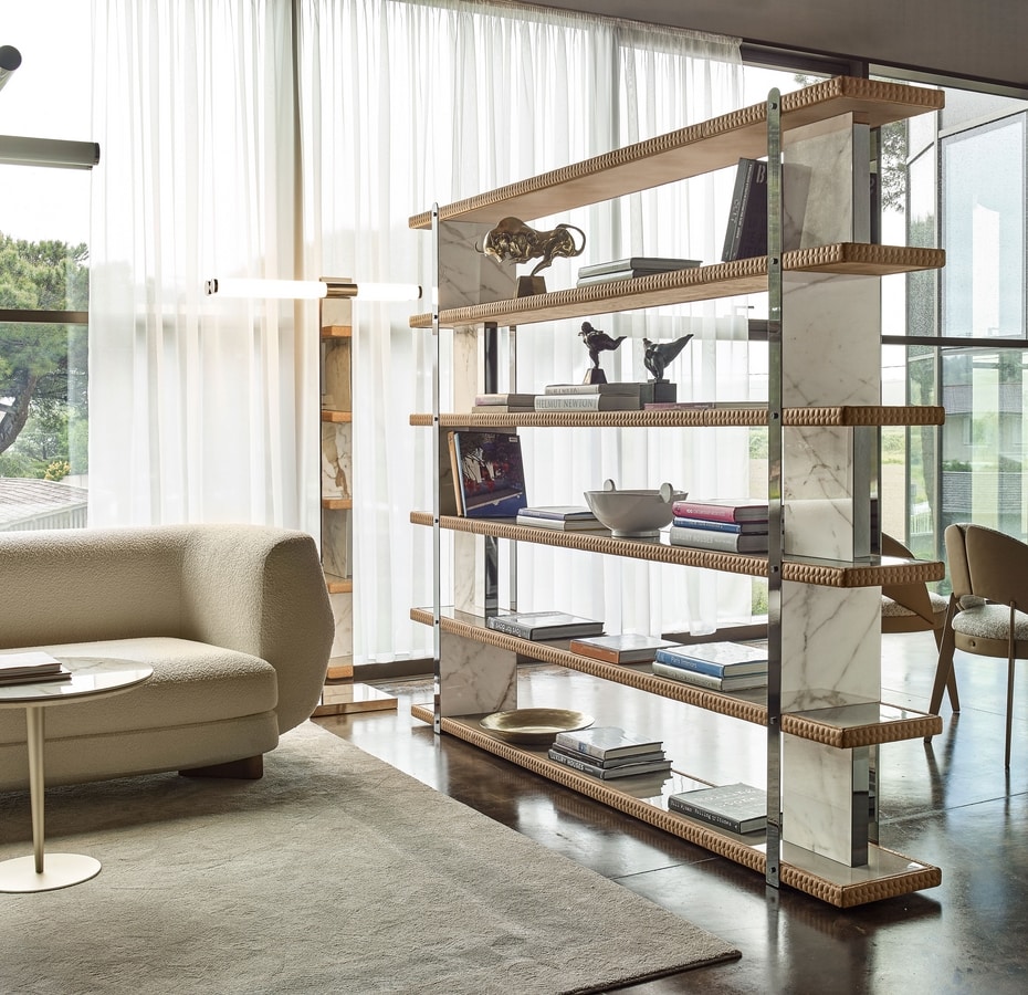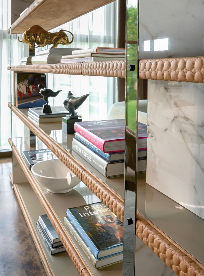 Libreria con ripiani in compensato di legno laccati e imbottiti. Sono uniti per mezzo di montanti in metallo e gres.