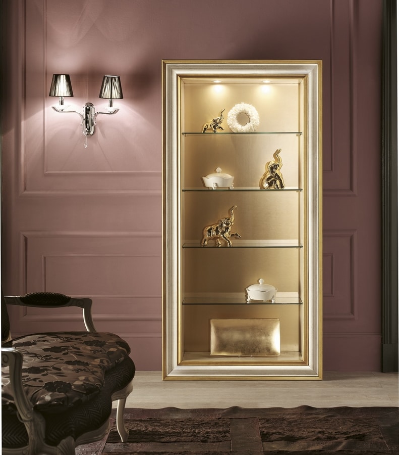 Libreria a giorno con faretti, ripiani in vetro. Finitura oro ed argento.