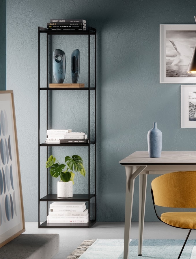 Libreria modulare in metallo. Caratterizzata da un design minimale.