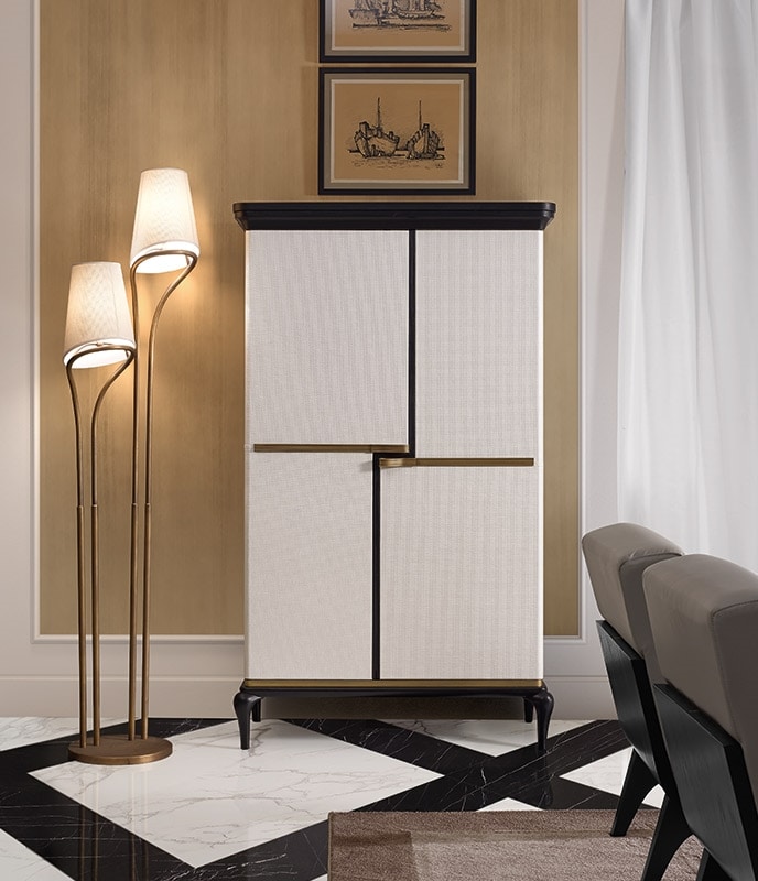 Mobile bar con struttura in multistrato ed MDF impiallacciato, cornici e base in legno massello di frassino. Ripiani in vetro. Cassetto dotato di guide blum. Maniglie e profili in metallo ottone brunito. Fianchi e sportelli rivestiti da ecopelle.
