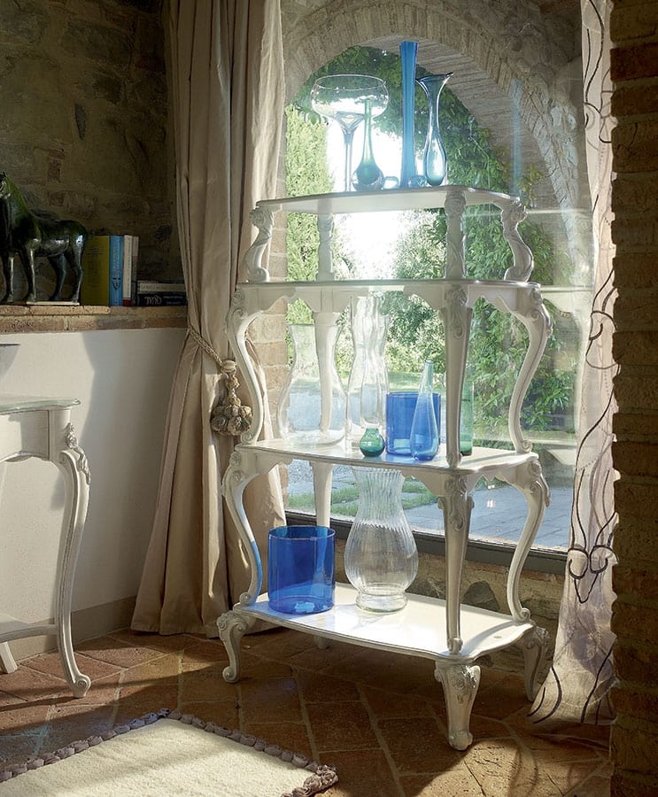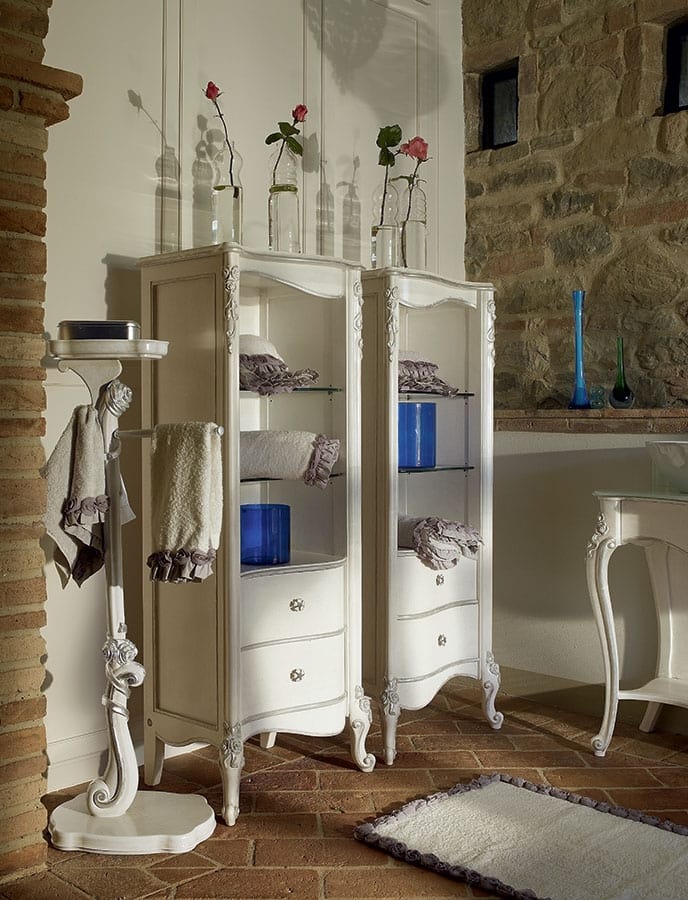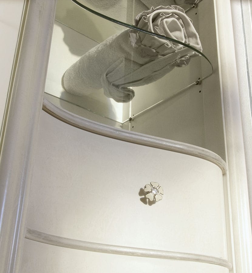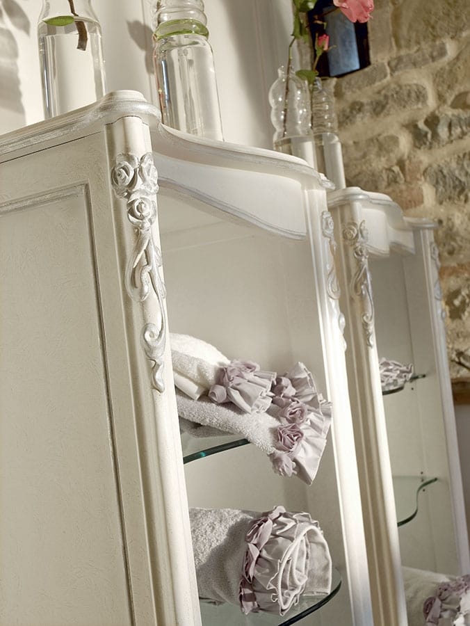 Un connubio perfetto tra eleganza classica e pratiche soluzioni contemporanee. Questo è il bagno firmato Volpi. In questa soluzione a due lavabi la finitura bianca spugnata argento gioca su tonalità soft. Comodi gli etagere CAPRI, elegante il portasciugamani da terra. Specchiera ovale grande DILETTA.