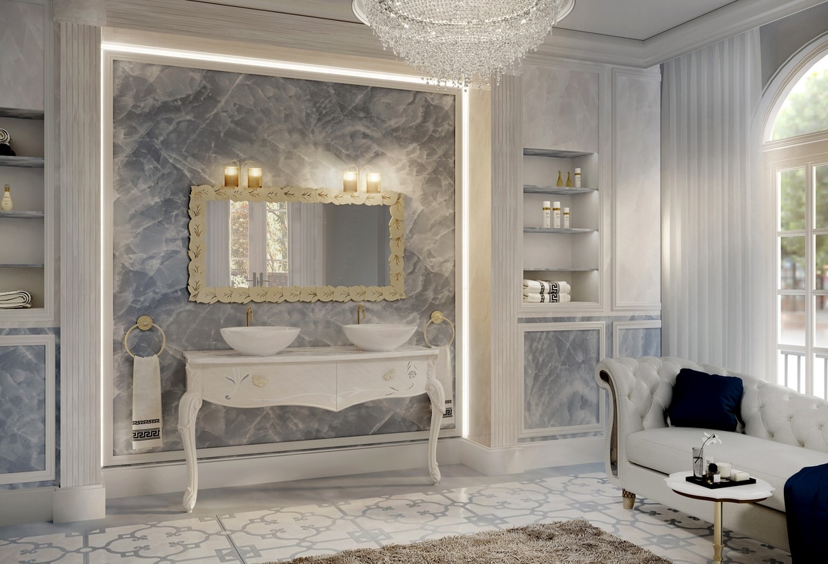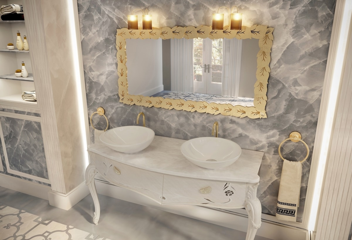 Raffinato mobile da bagno in legno laccato, con decori ed intagli realizzati a mano. Dotato di 2 lavabi da appoggio. Mobile con 2 cassetti.