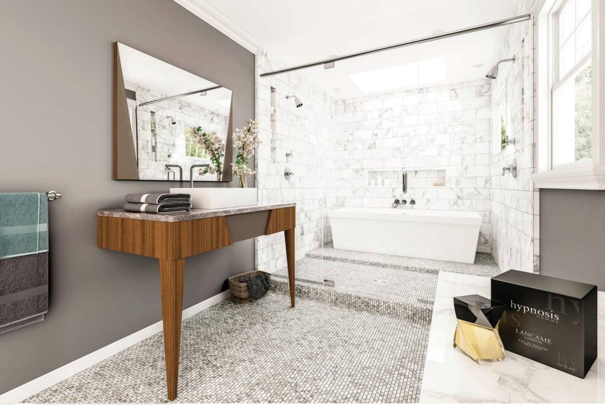 Arredo per bagno moderno. Mobile in legno con lavabo in appoggio. Struttura in legno e finiture in noce Canaletto.