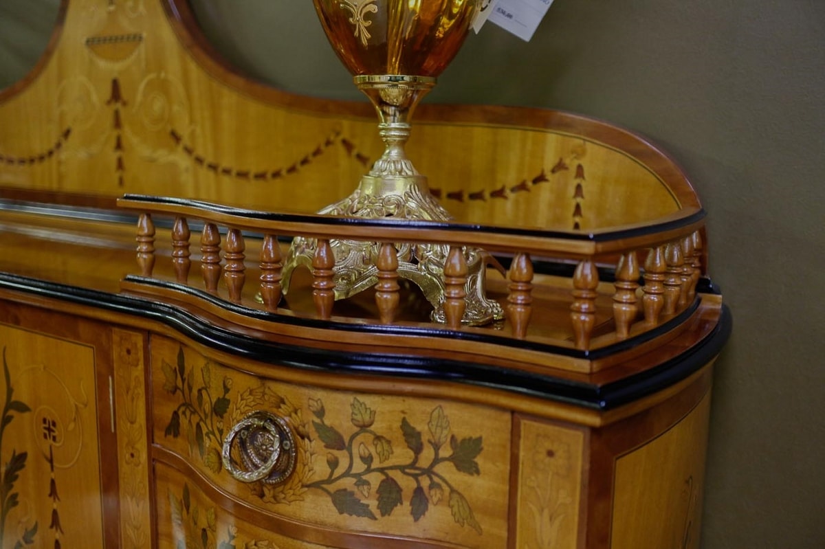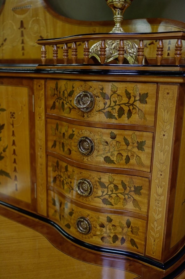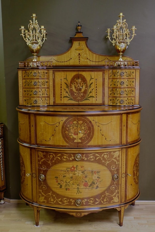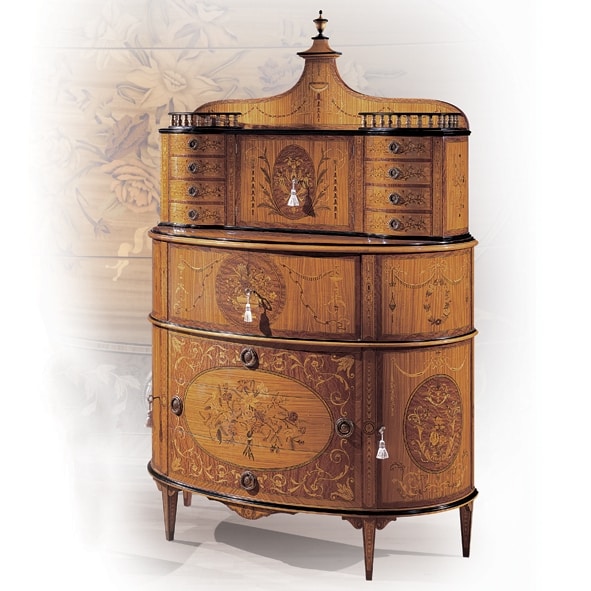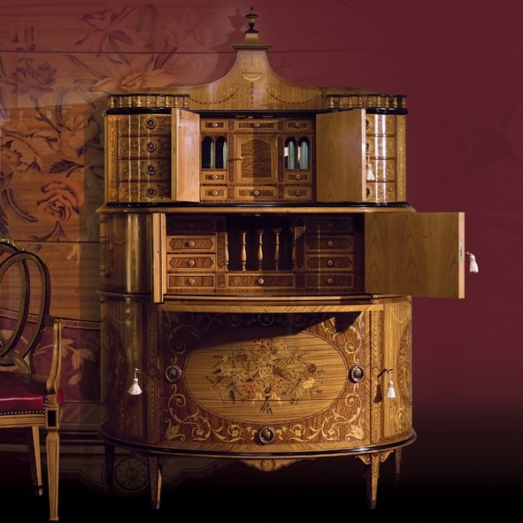 Mobile stile Maggiolini intarsiato in citronnier e radica di pomelé. Si ispira agli intarsi elaborati realizzati verso la fine del ‘700 e l’inizio dell’800 dal famoso ebanista italiano Giuseppe Maggiolini. Lo stile Maggiolini è da sempre ricercato e di grande effetto per i suoi ricchi intarsi eseguiti da abili ebanisti. Le stesse linee curve si possono ritrovare nella camera 3460. Questo pezzo infatti può essere utilizzato oltre che nelle hall, nella camera da letto come secretaire.