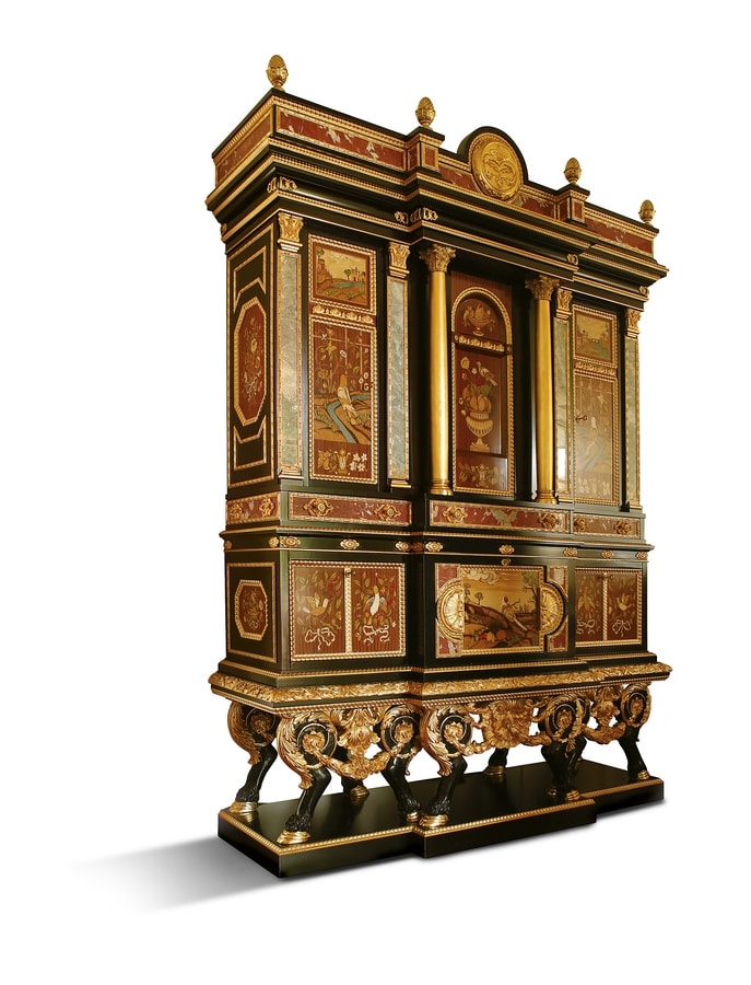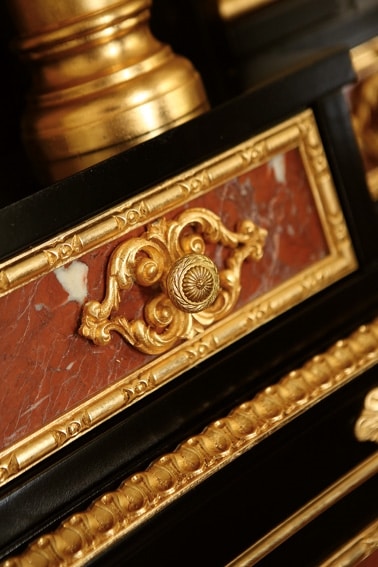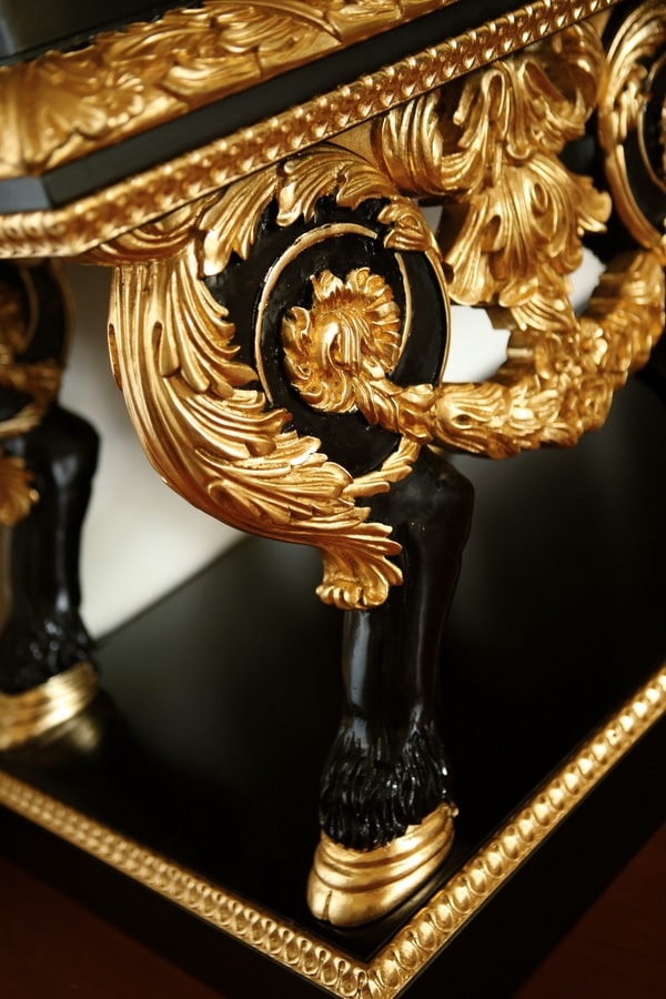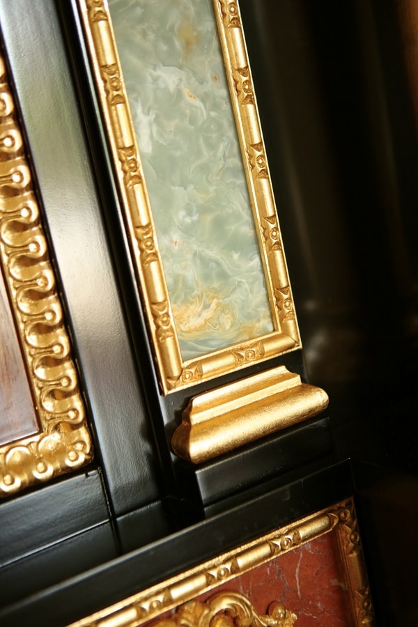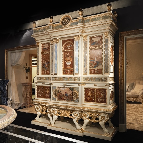 Riproduzione mobile del Seicento realizzato per Luigi XIV laccato nero con intagli dorati e pannelli intarsiati con marmi preziosi. Proposto in due versioni con laccatura bianca o nera , permette di adattarlo al meglio ad altri arredi, la Sua maestosità però lo fa spiccare. Negli ingressi e nei saloni trovano il giusto posto le nostre riproduzioni di mobili storici. Gli elaborati intarsi, espressione più alta dell’ebanisteria made in Italy, arricchiscono le nostre creazioni rendendole sofisticate ed uniche.
