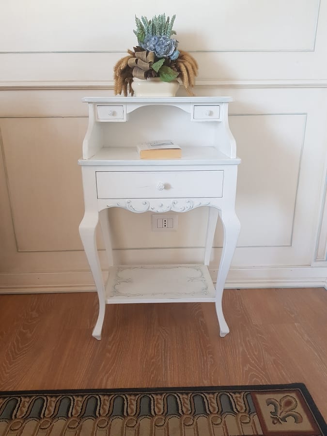 Mobiletto porta telefono, in legno laccato, con decorazioni a gesso in rilievo.