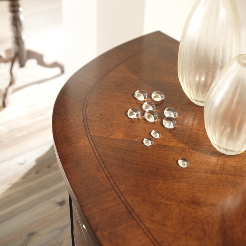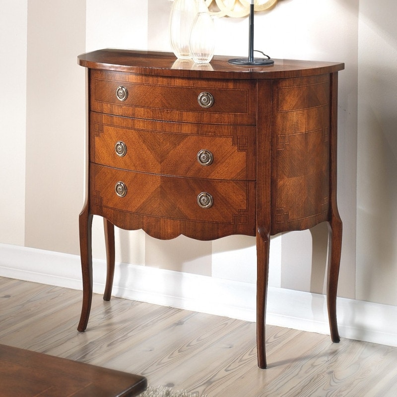 Richiedi prezzi Prodotti similiCredenzina sagomata a mezzaluna con tre cassetti, realizzata in legno di noce lavorato a spina di pesce con filetti in bois de rose. Le gambe alte slanciano in mobile rendendolo molto elegante. Opere uniche realizzate con tecniche antiche che trasmettono la maestria dal passato ai nostri giorni.