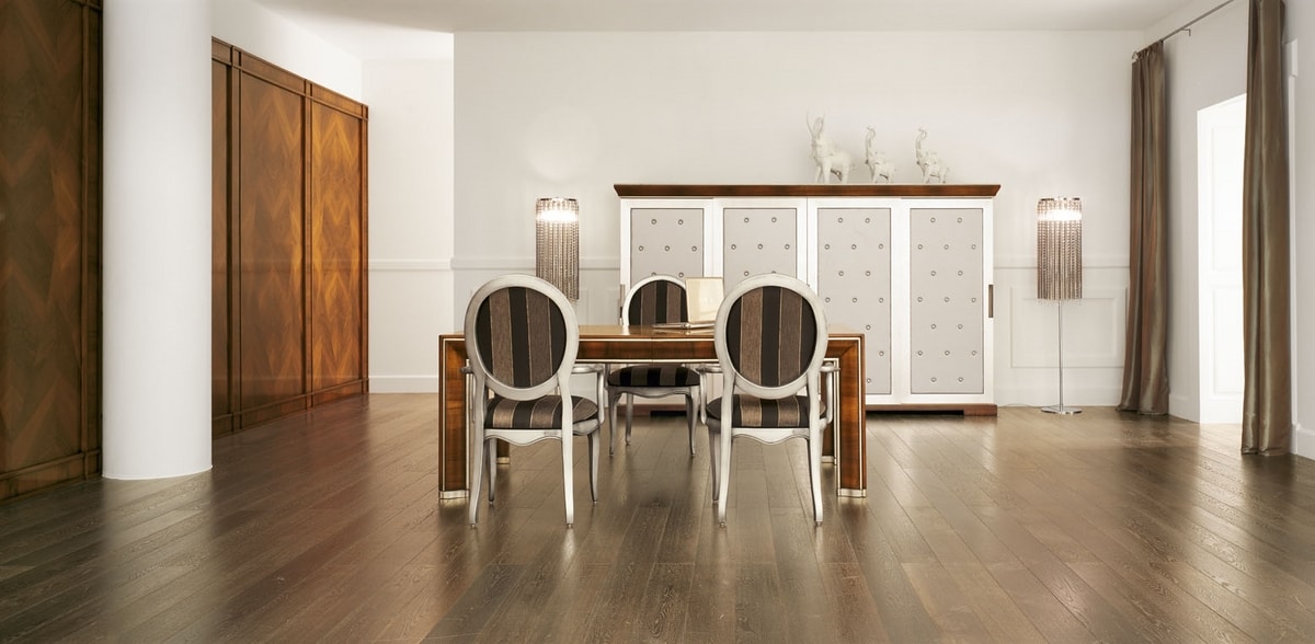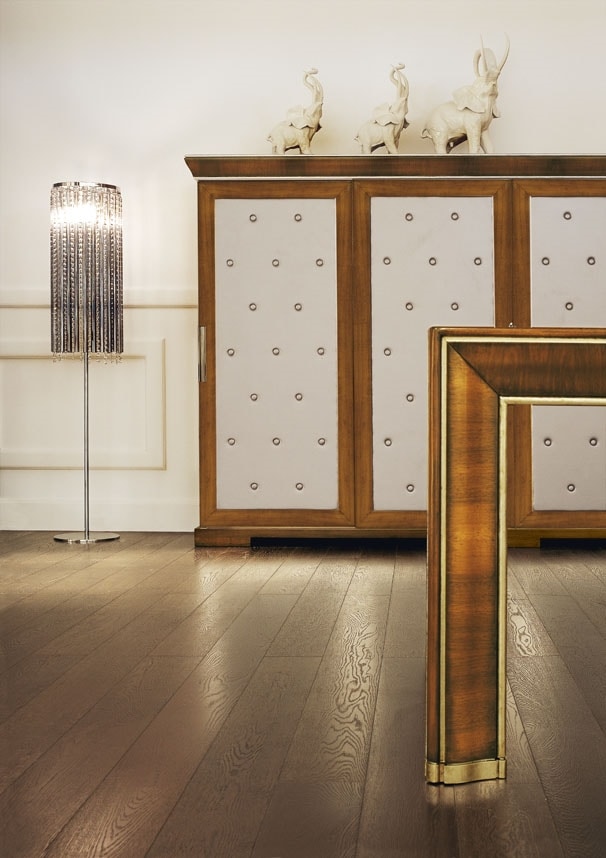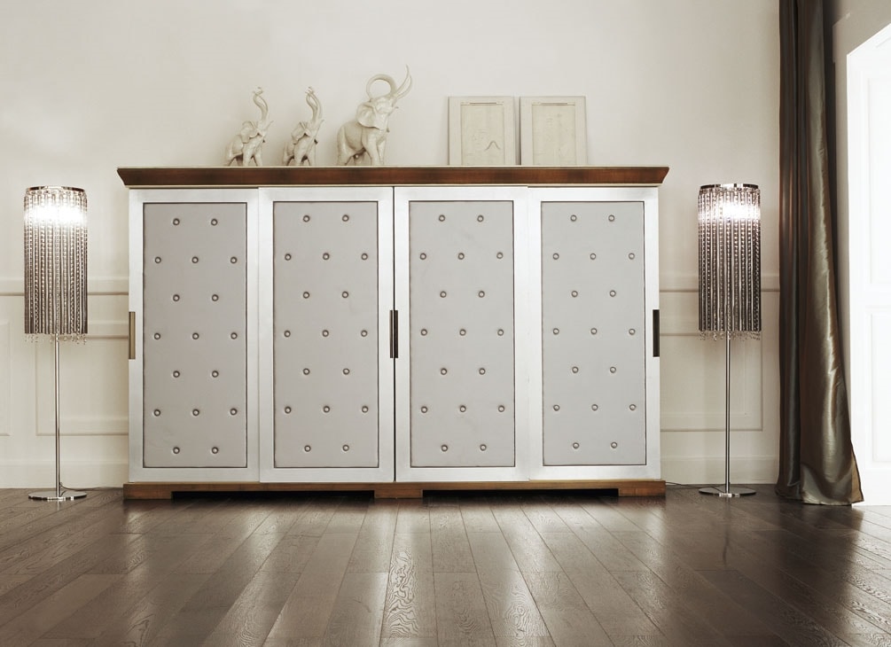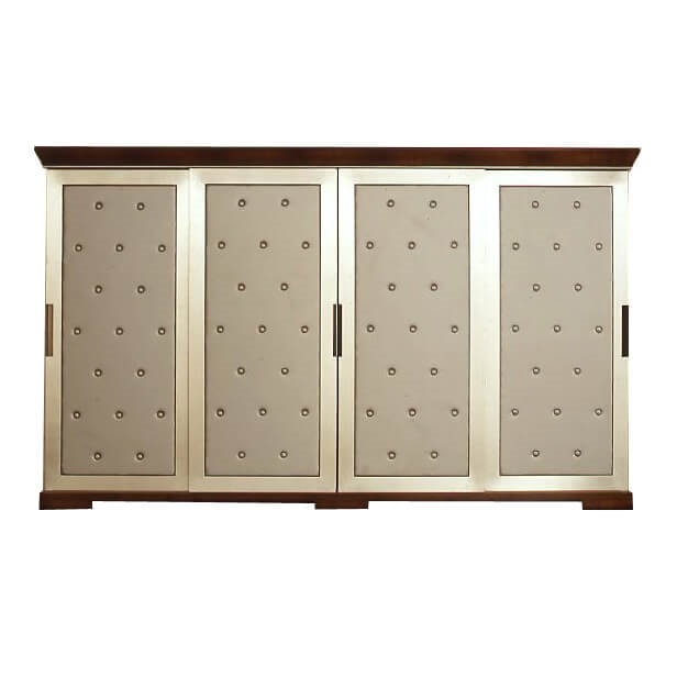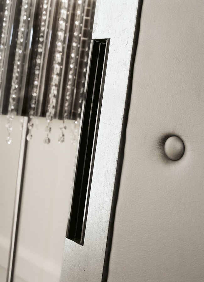 Armadio in noce con cornice sagomata in piuma di noce, quattro porte scorrevoli tappezzate con pannelli in ecopelle argento in stile capitonné. Interni in legno di frassino composti da due cassetti e ripiani. Nella foto, legno di noce tintato e patinato (codice: MI01) e anticatura leggera, ante in foglia argento patinata (codice: Foglia argento).