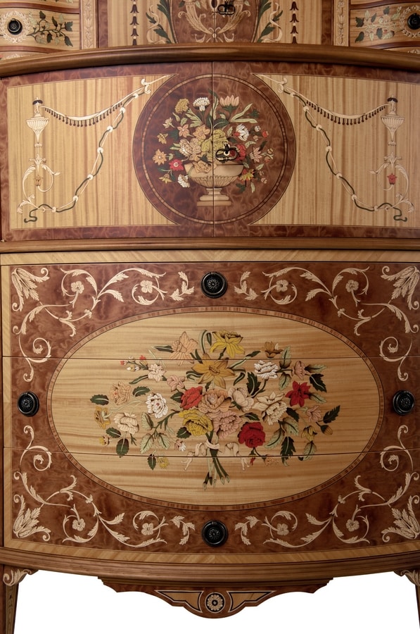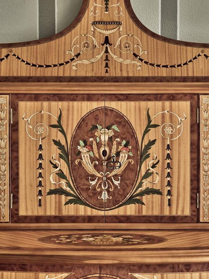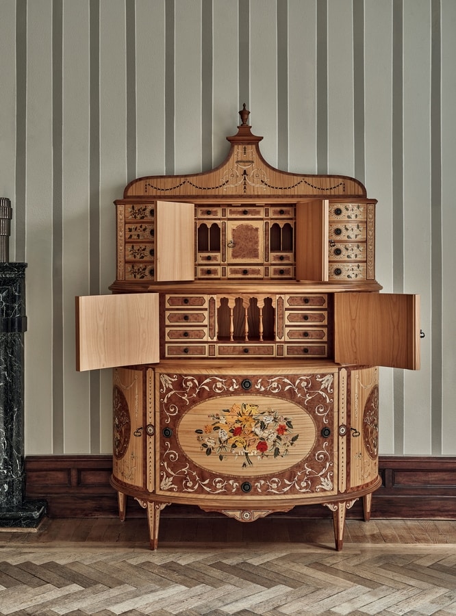 Prestigioso secretaire intarsiato in stile Maggiolini, realizzato da abili mani dei nostri artigiani che con la loro esperienza usano gli intarsi come fossero dei ricami.