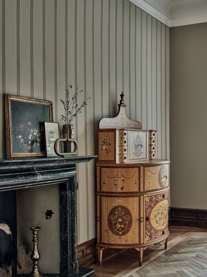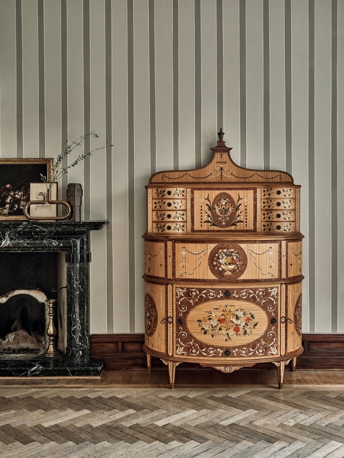 Un arredo di forte valenza artistica, recuperato dagli archivi della Bellotti Ezio nella sua bellezza artigianale, fatta di molteplici e ricercati intarsi e intagli, valorizzati da una nuova finitura verniciata che mette in evidenza la naturalità del legno.