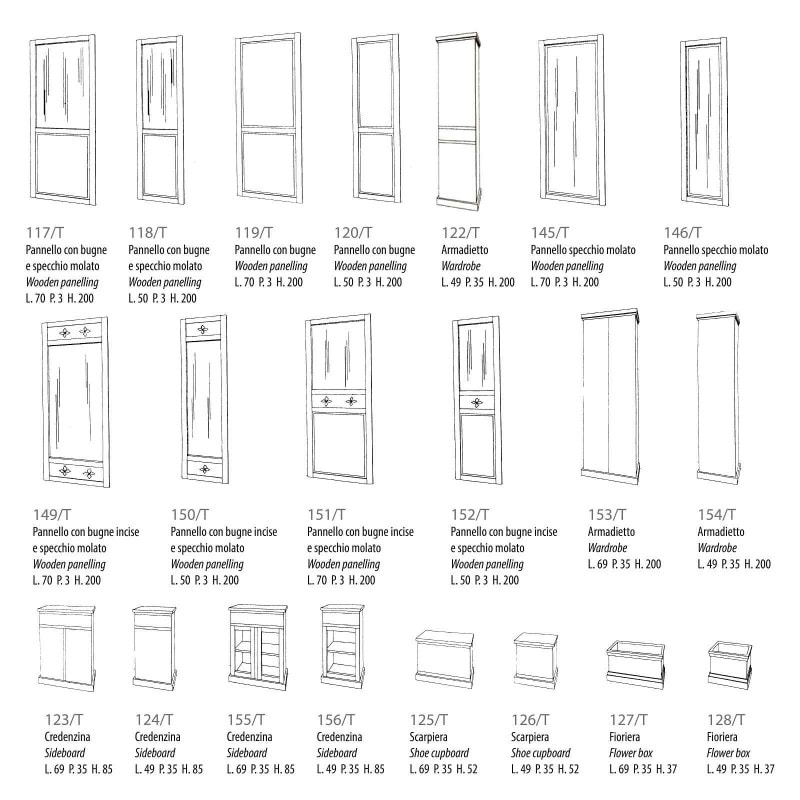 In questa collezione sono previsti mobili dedicati alla cucina di casa e alla sala del ristorante. Infatti si possono trovare delle piacevoli basi con pensili, mobili portafrigo, dispense di varie misure e taglieri, anche con ruote.