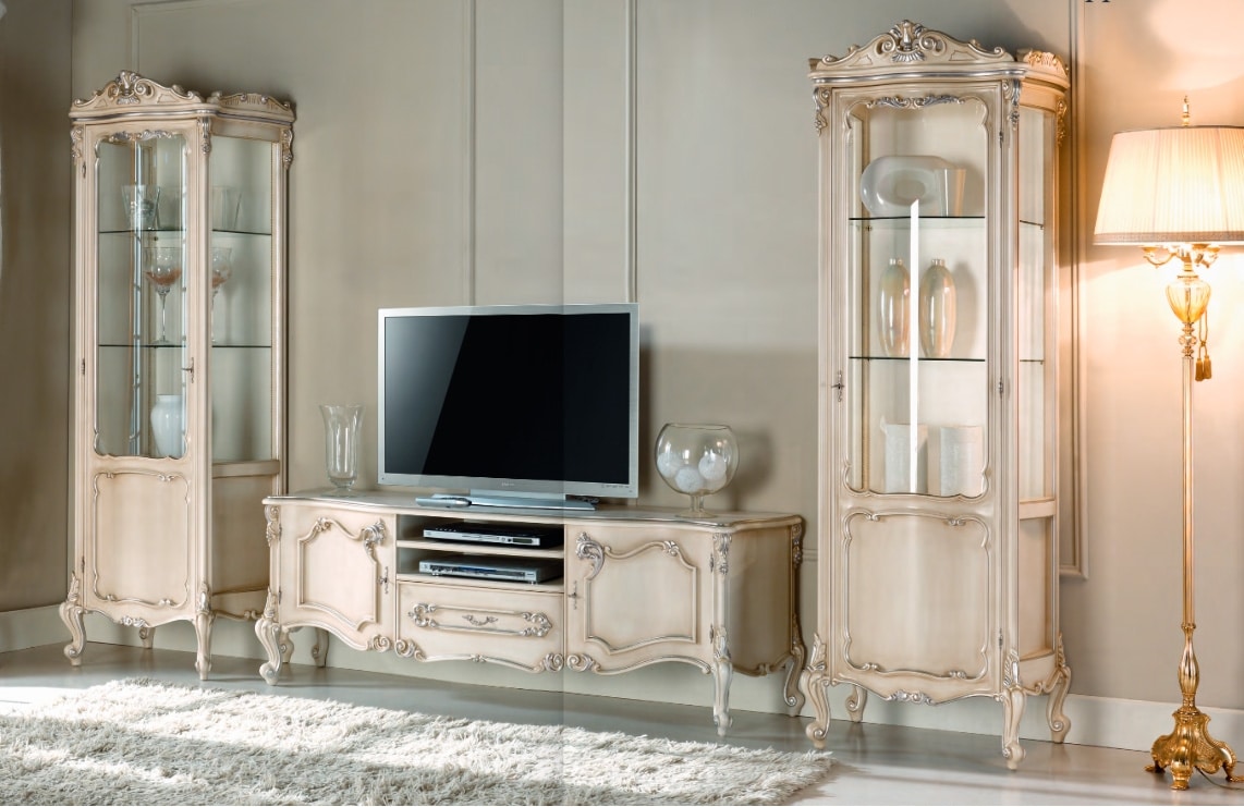 Vetrinette ad una anta e mobile porta tv LCD in stile Roccocò.