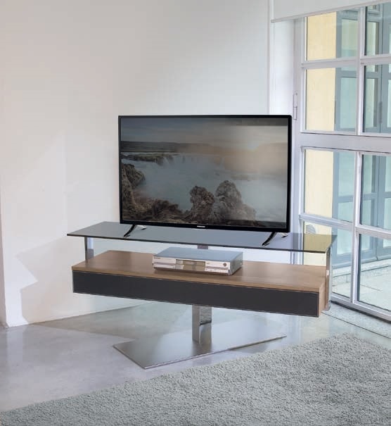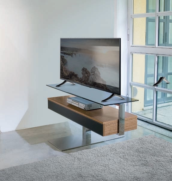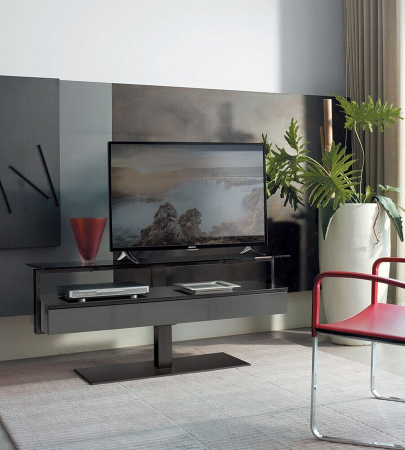 Porta TV girevole a 360°, struttura e base in acciaio, cassetto in legno o legno laccato, frontale cassetto in legno, legno laccato o rivestito in cuoio, piano porta TV in cristallo temperato.