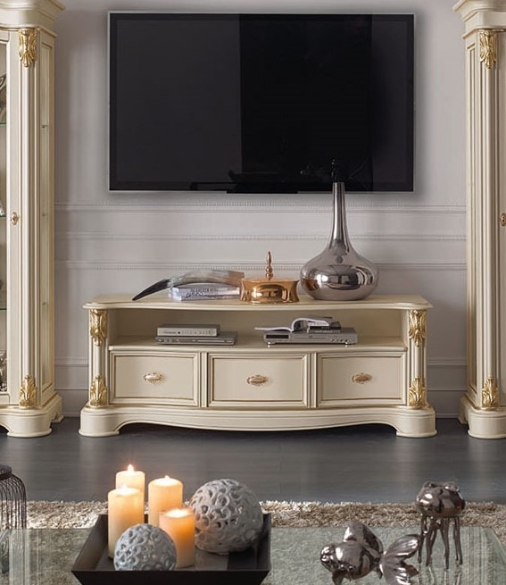 Mobile porta tv con 3 cassetti. Struttura in legno con intagli decorativi e dettagli oro.