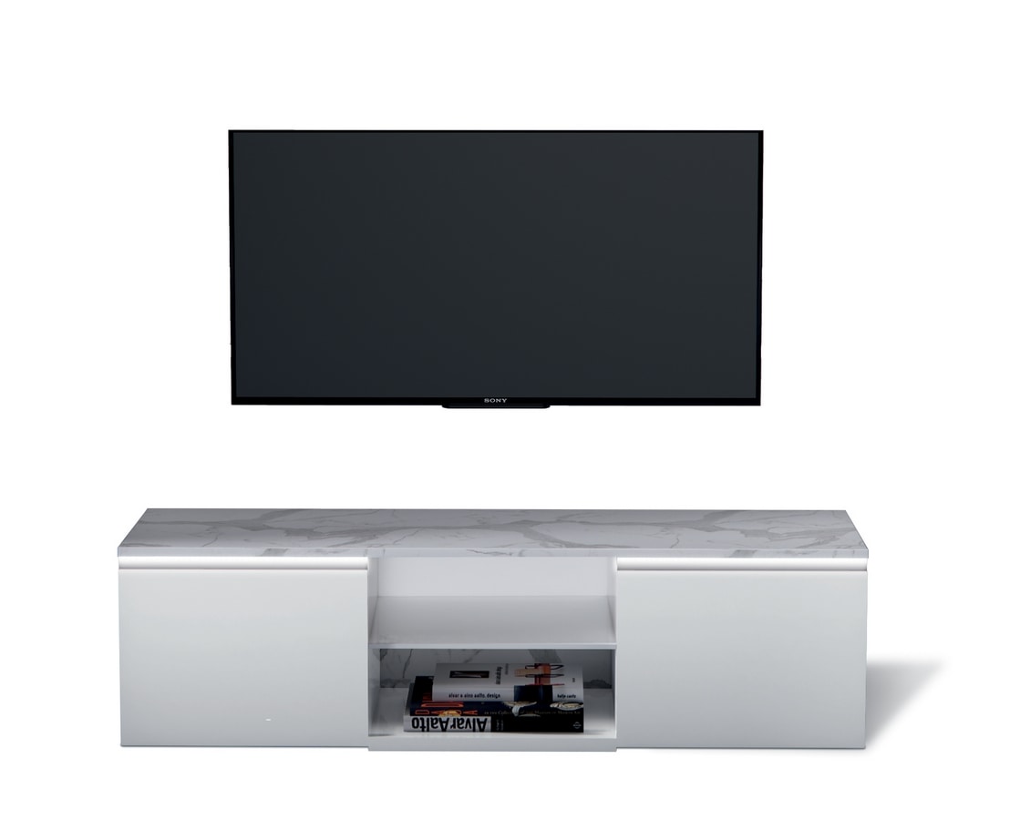 Mobile porta TV con struttura e ante in laccato bianco con interni in finitura marmo Carrara bianco.