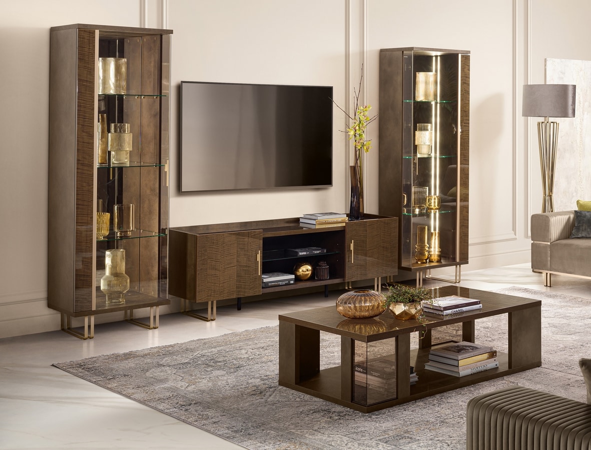 Le geometrie sobrie e pulite sono impreziosite dalla finitura in sicomoro noce high-gloss che contraddistingue le superfici, rendendole luminose e profonde e regalando raffinati giochi di riflessi.
