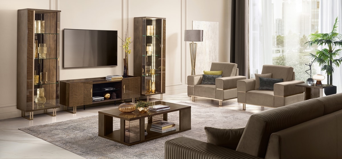 Fiamma è pensata come un sistema completo di arredi per la sala da pranzo, per il living e per la camera da letto, offrendo continuità stilistica in ogni ambiente della casa.