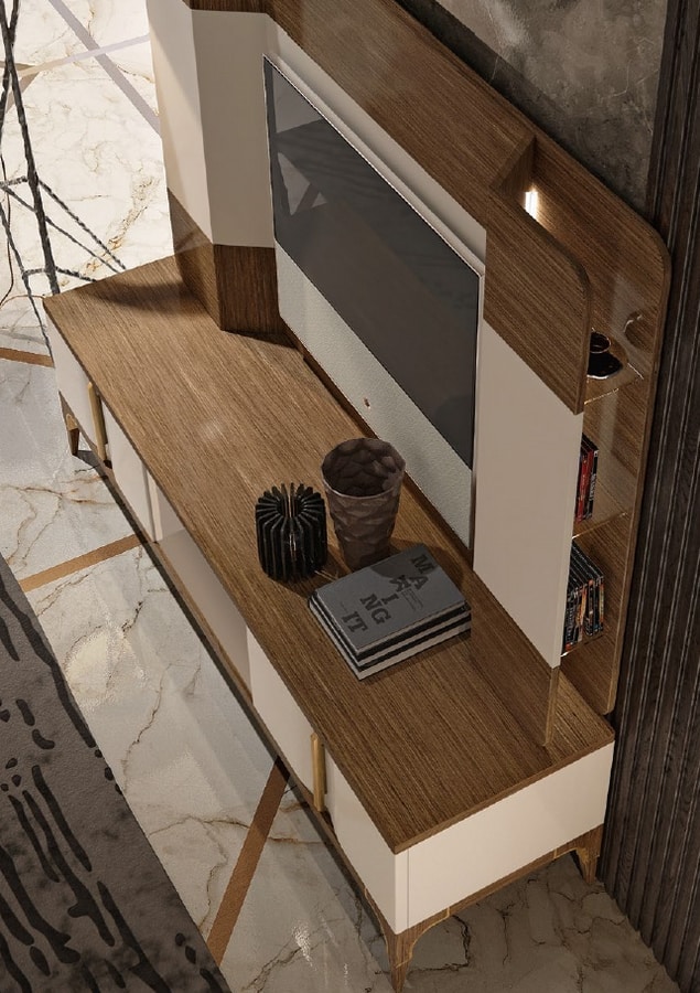 La zona giorno, si rivela luminosa e accogliente, qualità preziose che nascono dalle felici combinazioni tra l’essenza noce, la laccatura chiara, i metalli dorati e i tessuti in tono. E’ un invito quotidiano alla serenità e alla rilassatezza, nella loro forma più ricercata.