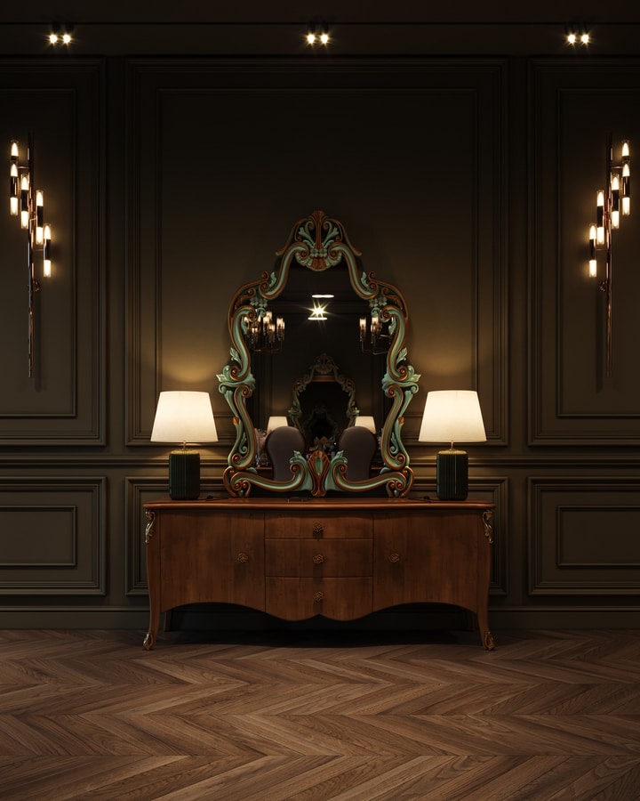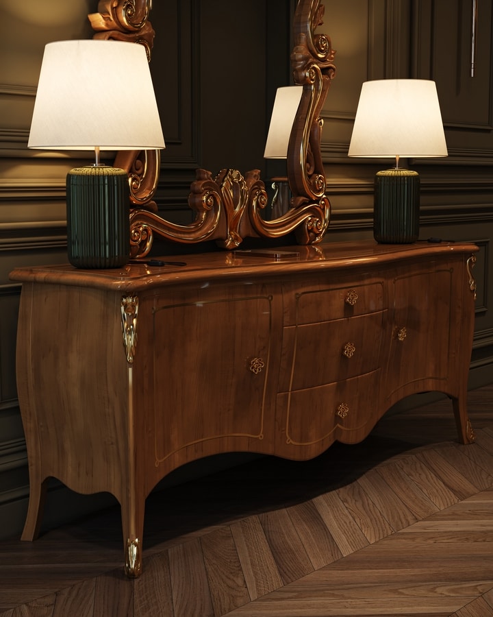 Mobile porta tv basso in stile classico, realizzato in legno.
