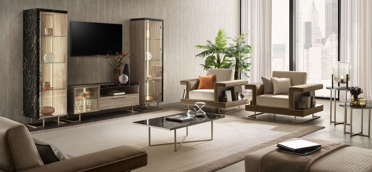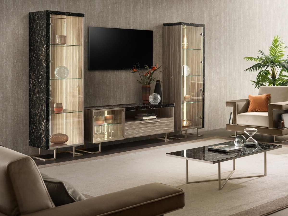 Richiedi prezzi Prodotti similiDesign Made in Italy e mood contemporaneo per la collezione Luce Dark di Adora, pensata per arredare con stile ed eleganza il salotto, il living e la zona notte. Una collezione sobria e minimale che valorizza le asimmetrie con materiali e forme a contrasto. Leitmotiv della collezione, oltre all’elemento luce che le dà il nome, è la ricerca di un equilibrio tra densità e trasparenza, rimandi e variazioni. L’asimmetria è alimentata dall’alternanza di vani a giorno e volumi chiusi, ma anche dalla coesistenza tra l’effetto marmo Portoro Gold (freddo e scuro) del rivestimento di piane e fianchi, e la finitura legno effetto zebrano (calda e chiara) delle ante. Piedini e maniglie in metallo satinato color champagne sono volutamente minimali per lasciare il ruolo da protagonista al design di mobili e vetrine. Sia gli specchi che le luci interne agli elementi d’arredo donano alla collezione un surplus di luce, prospettiva e appeal contemporaneo. Il concept d’arredo premia il dinamismo e la progettazione sartoriale tipica dello stile contemporaneo senza perdere di vista i materiali pregiati, il design sofisticato e i dettagli di lusso.