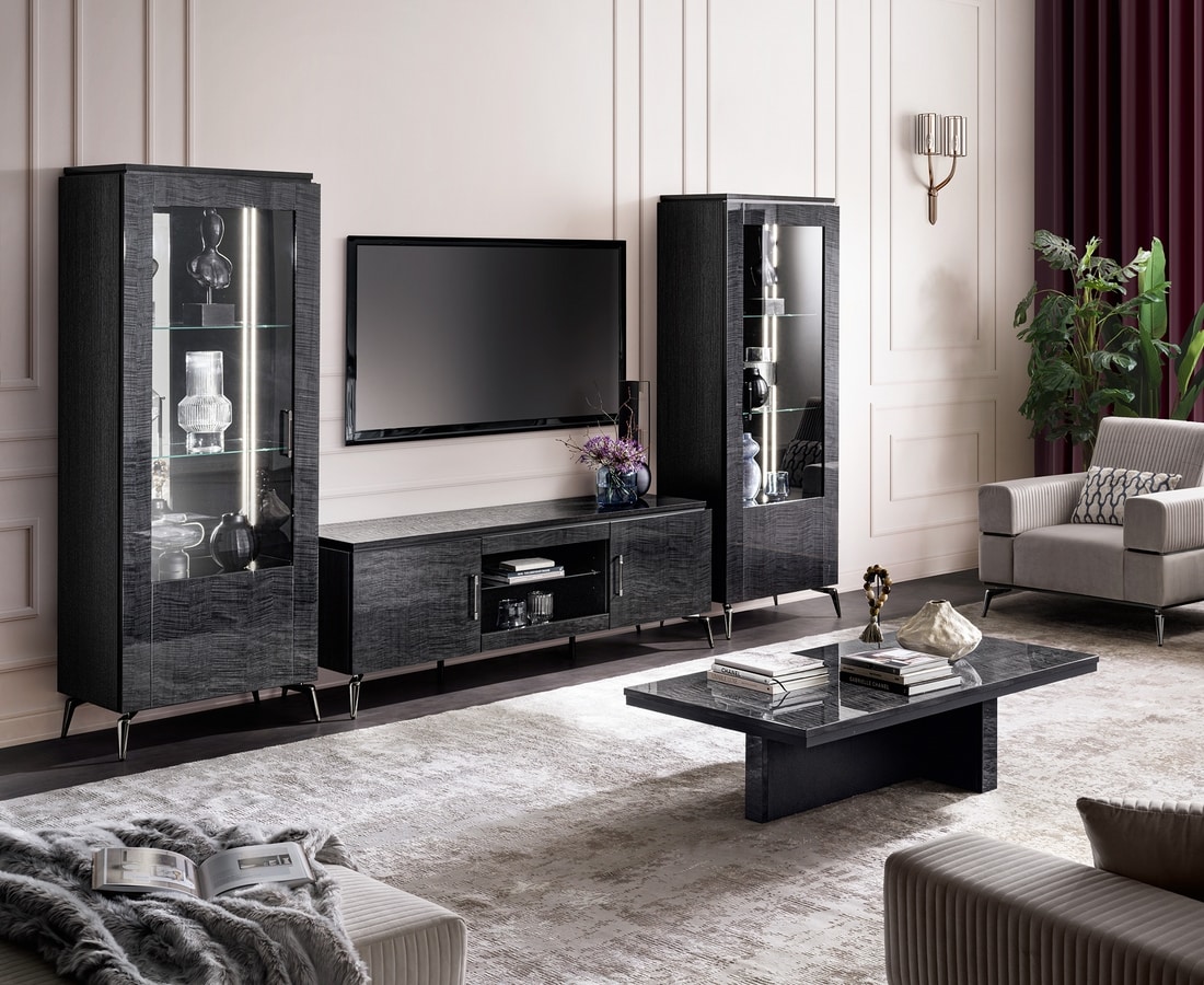 Un'estetica pulita e raffinata che riflette l’essenza dello stile contemporaneo. Il design minimal e la pulizia delle forme si accostano e si sposano con i materiali e le finiture di pregio, per vestire di innata eleganza le zone dining e living. Una sofisticata finitura legno Sycamore laccata lucida color grigio fumé è il fil rouge che lega tutti gli elementi della collezione Meridiana: tavoli, vetrine, madie e una serie di complementi, quali consolle e occasional table. La possibilità di scegliere tra due diverse tipologie di finiture di piedi e maniglie permette di dare vita ad altrettanti accostamenti dal design esclusivo. La finitura black chrome incarna l’eleganza e la sobrietà del ton sur ton, mentre la finitura oro lucido è il dettaglio che non passa inosservato, come un’immediata dichiarazione di stile. La specchiera è impreziosita dal vetro retrolaccato grigio effetto flute, mentre le luci LED creano inattesi bagliori nelle vetrine e nelle madie. Ogni piccolo dettaglio rispecchia l’intento della collezione Meridiana: esprimere l’essenza del lusso contemporaneo. Una semplicità chic e ricercata per la zona giorno e il salotto.